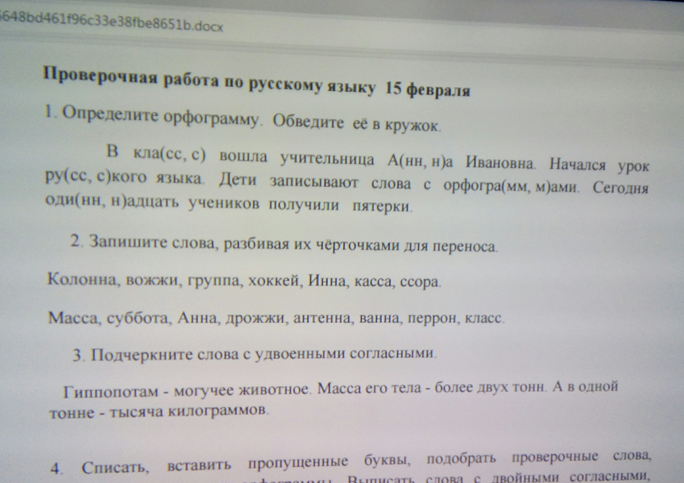 №1:В класс вошла учительница Анна Ивановна.Начался урок русского языка.Дети записывают слова с орфограммами.Сегодня одиннадцать учеников получили пятёрки.№2:Колон-на,вож-жи,груп-па,хок-кей,Ин-на,кас-са,ссо-ра.Мас-са,суб-бота,Ан-на,дрож-жи,Антен-на,ван-на,пер-рон,кла-сс№3:Гиппопотам,масса,тонн,тонне,килограммов.№4:там не видно