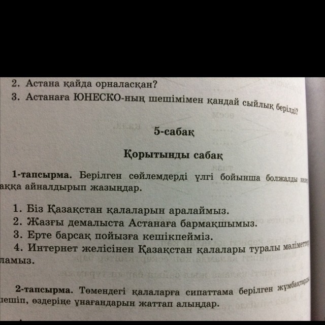Біз Қазақстан қалаларын аралармыз.Жазғы демалыста Астанаға барармыз.Ерте барсақ пойызға кешікперміз.Интернет желісінен Қазақстан қалалары туралы мәліметтер алармыз .