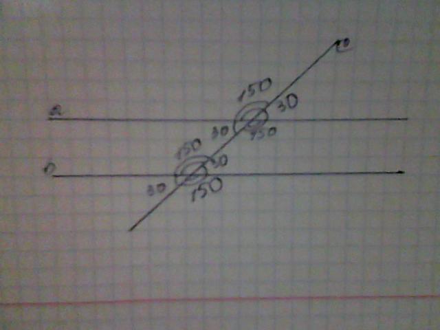 прямые а и b параллельные с секущая. Один из соответственных углов равен 30 градусов.Найдите остальные углы.