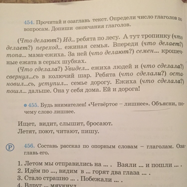 Ежиная семья у себя дома. Идут (мн.ч) ребята по лесу. А тут тропинку переходит (ед.ч) ежиная семья. Впереди топает(ед.ч) мама-ежиха. За ней семенят(мн.ч) крошечные ежата в серых шубках. Увидела ( ед.ч) ежиха людей и свернулась (ед.ч) в колючий шар. Ребята остановились(мн.ч), уступили(мн.ч) семье дорогу. Ежиха пошла(ед.ч) дальше. Она у себя дома. Ей и дорога!