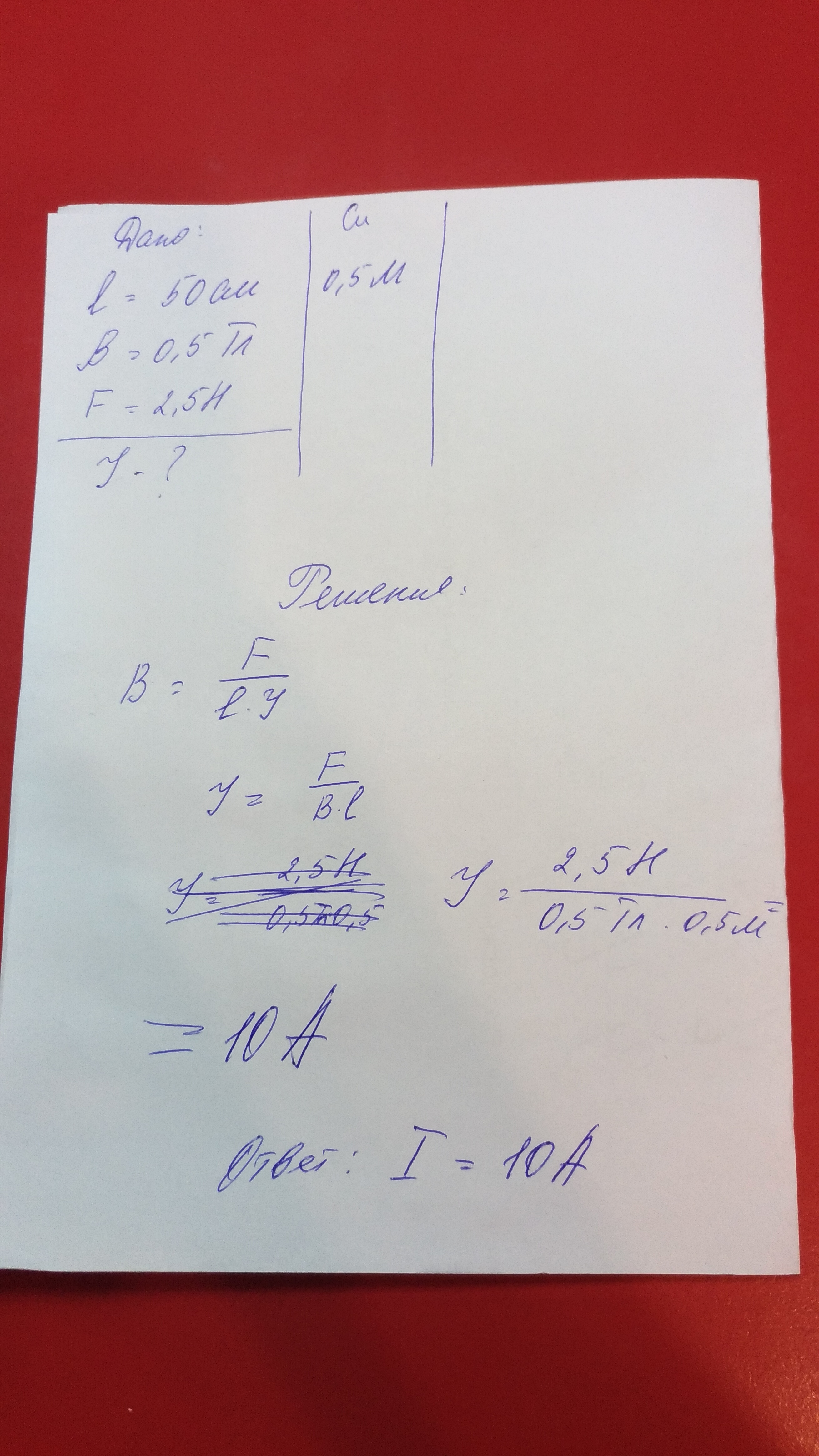 Чему равен ток в проводнике длиной 50 см находящемся в однородном магнитном поле с индукцией 0,5 Тл, ЕСЛИ НА НЕГО ДЕЙСТВУЕТ СИЛА РАВНАЯ 2,5Н? ПРОВОДНИК РАСПОЛОЖЕН ПЕРПЕНДИКУЛЯРНО СИЛОВЫМ ЛИНИЯМ ПОЛЯ