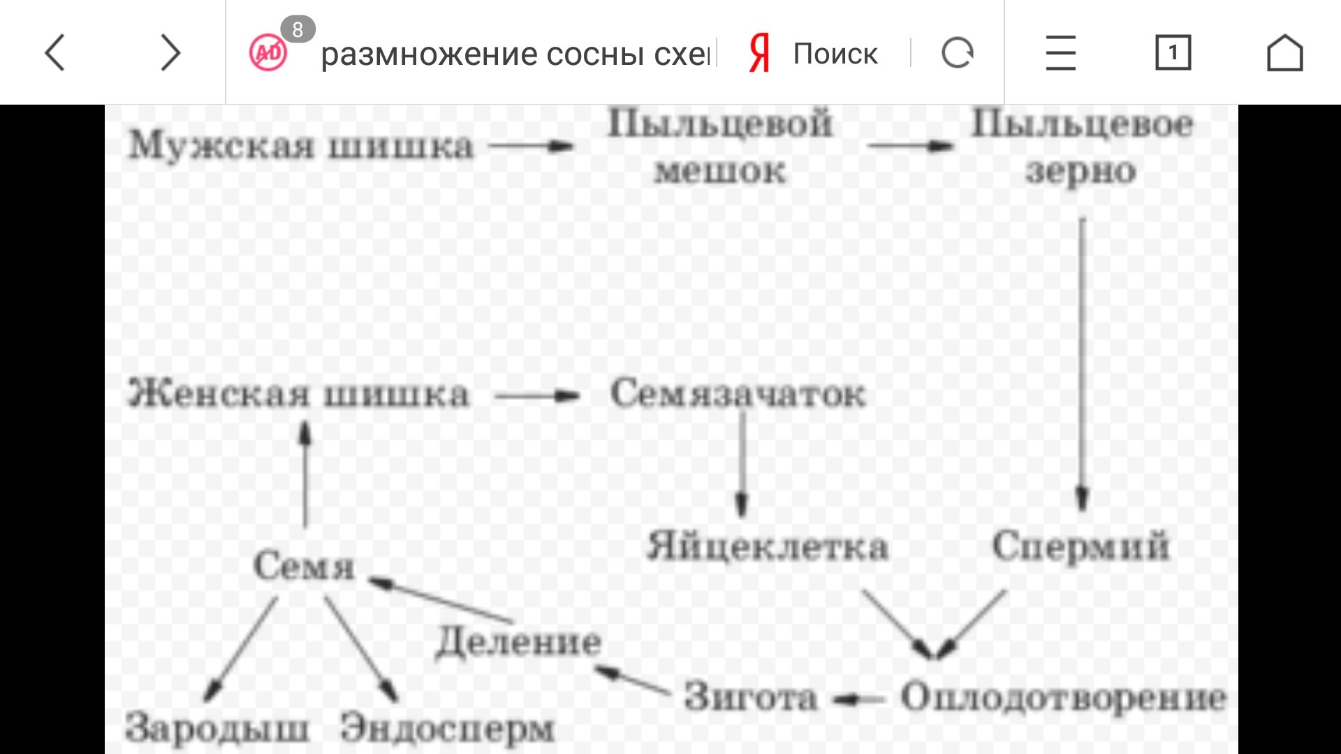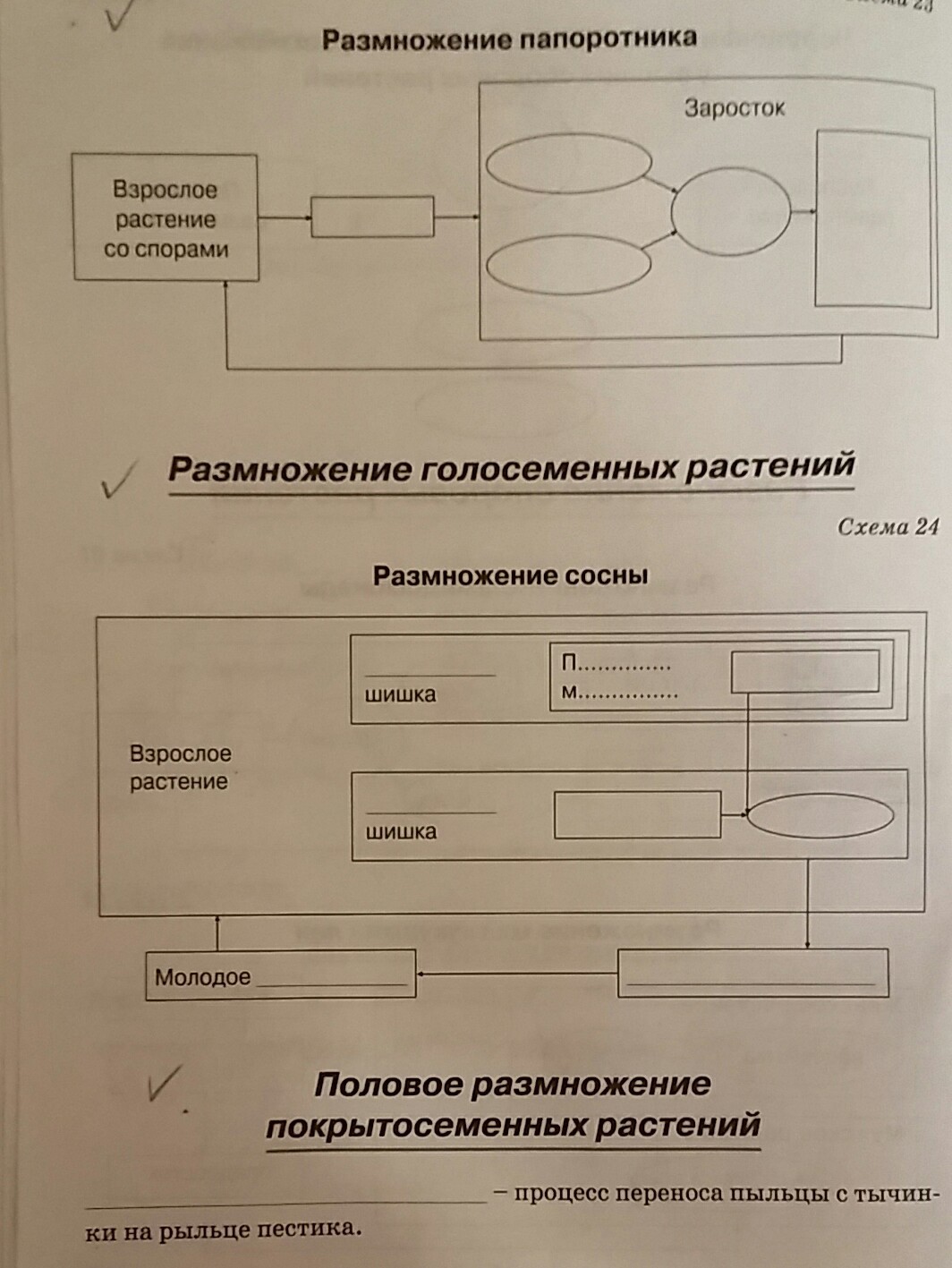 Папоротник : Спорангий,тетрада незрелых спор , зрелые споры , молодой гаметофит , зрелый гаметофит , антеридий и архегоний , сперматозойд и яйцеклетка , оплодотворенная яйцеклетка (зигота) , молодой спорофит , зрелый спорофит.