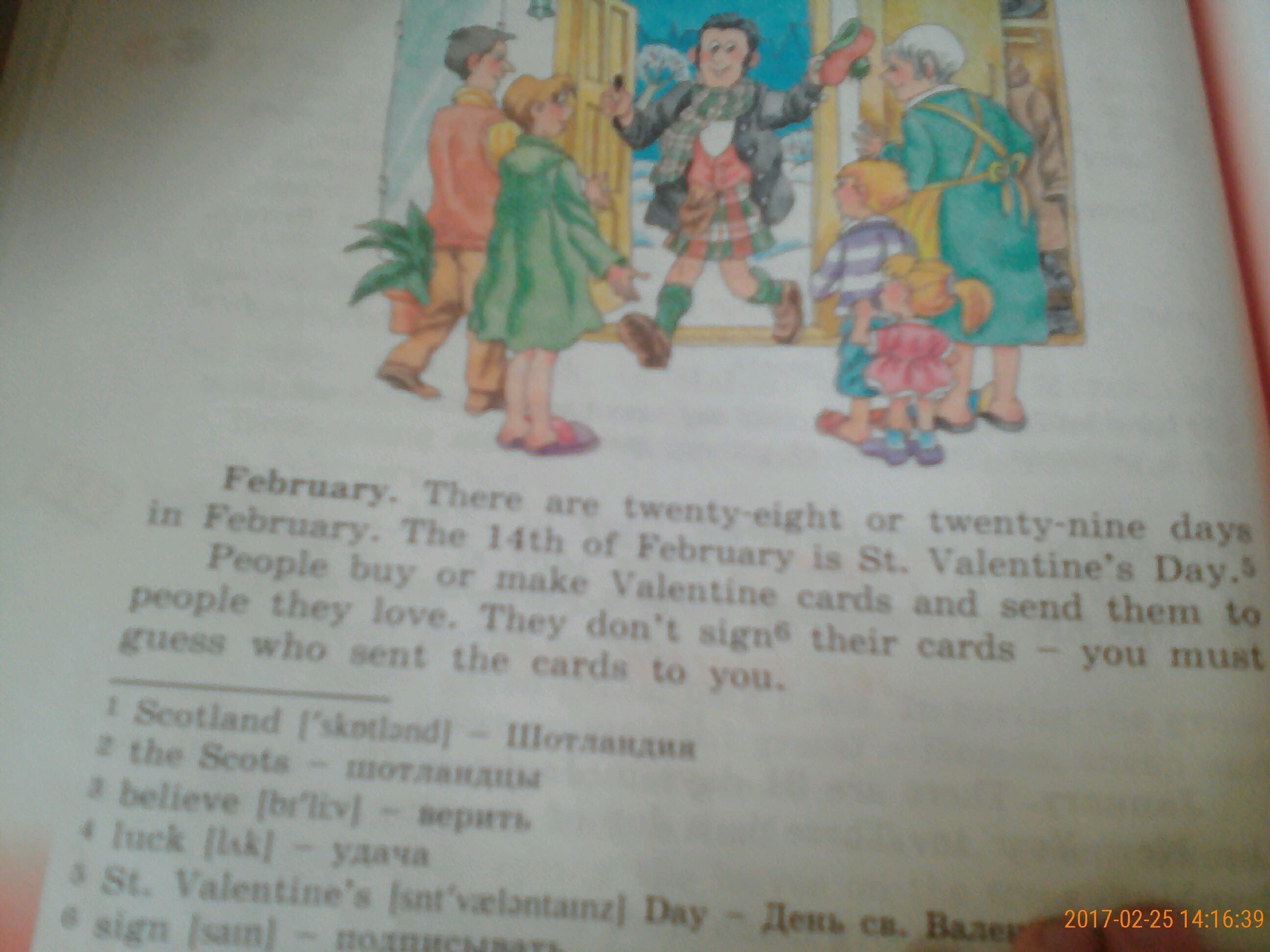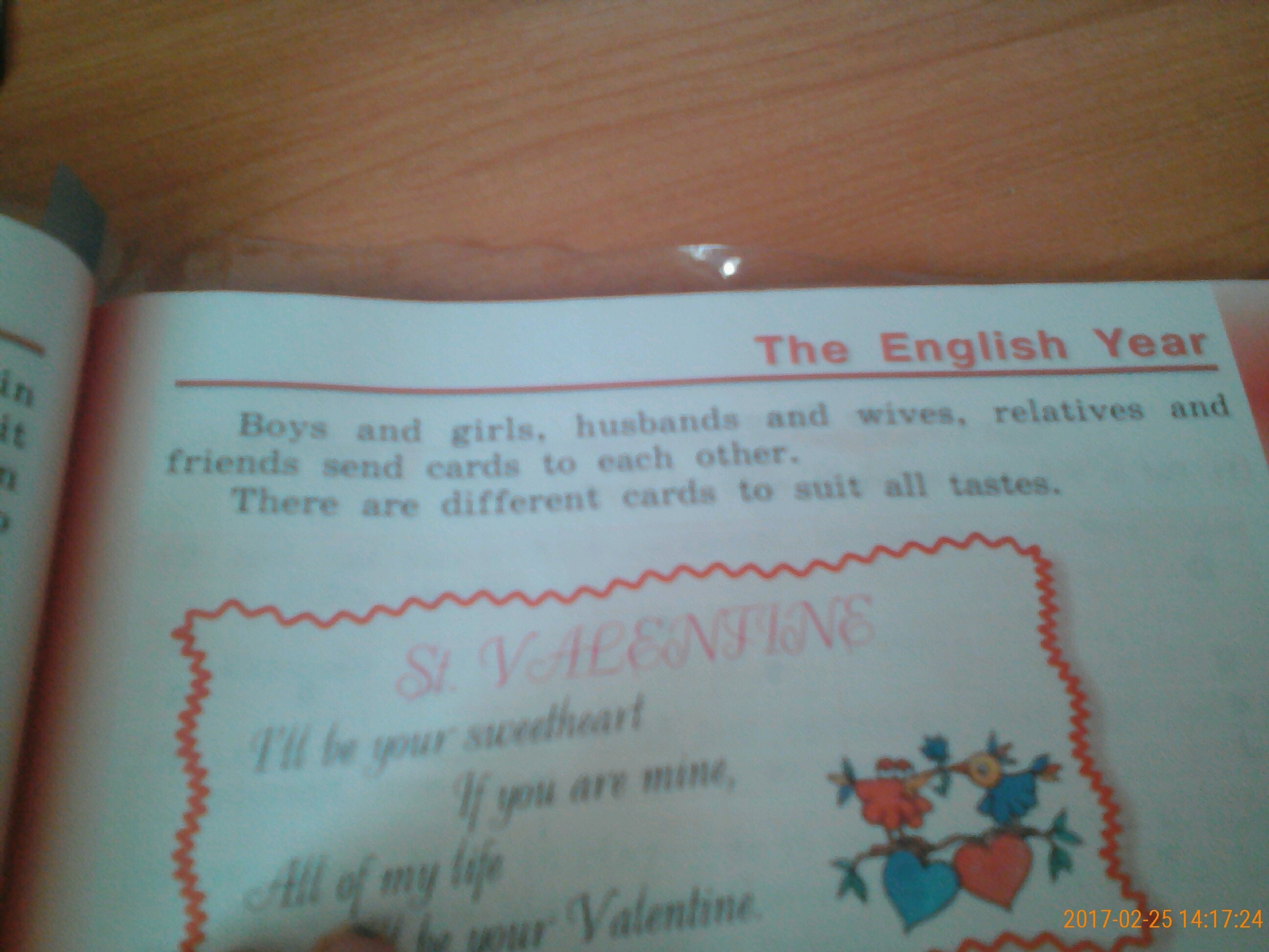 Февраль. В феврале бывает как 28,так и 29 дней. На 14-ое февраля выпадает день Святого Валентина. Люди покупают или мастерят валентинки и посылают тем,кого любят. Валентинки не подписывают -- ты должен угадать,кто тебе её отправил. Мальчики и девочки,мужья и жёны,родственники и друзья посылают друг другу валентинки. Их великое множество,на разный вкус и цвет.