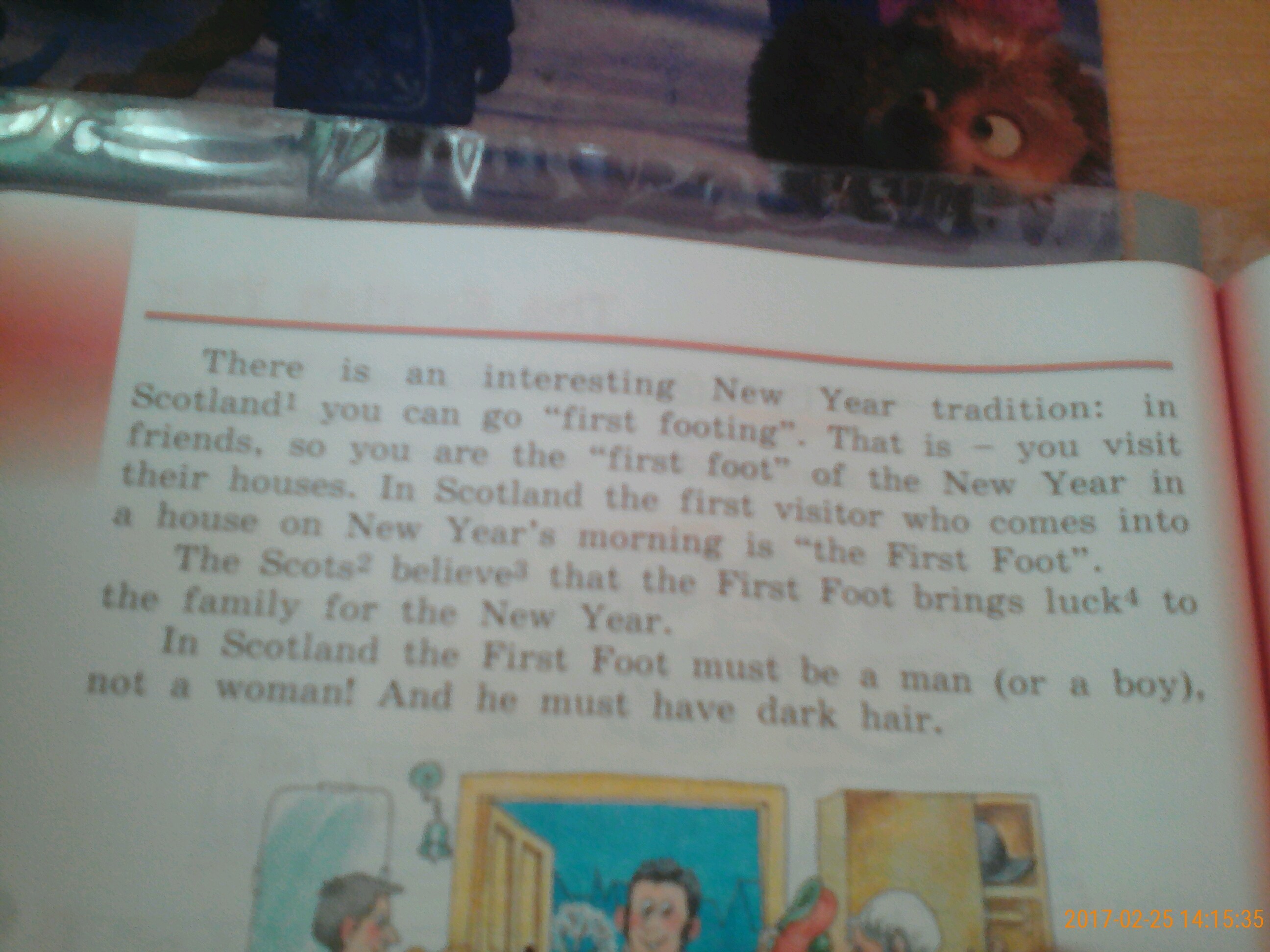 Есть интересная новогодняя традиция: в Шотландии ты можешь побыть первопроходцем. Это значит,что посещая друзей,ты несёшь Новый год в их жилища. В Шотландии "фёрстфутом" считается первый гость,вошедший в дом утром нового года. Шотландцы верят,что "фёрстфуты" приносят семье счастье в новом году. "Фёрстфут" обязательно должен быть мужчиной или мальчиком,но не женщиной. А также быть темноволосым.