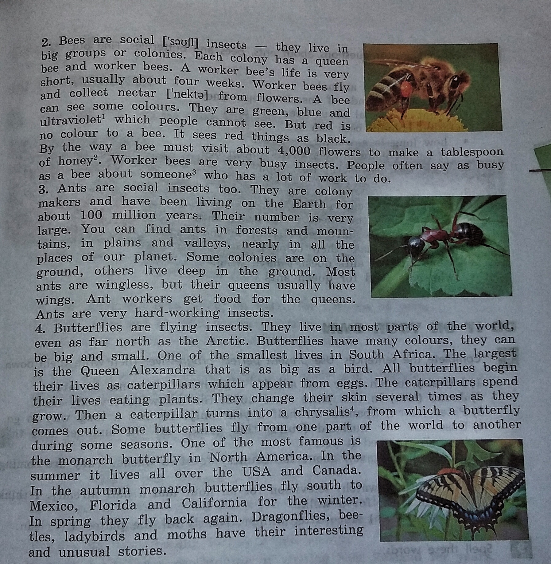 2. Пчелы соц. насекомые - они живут группами или колониями. У каждой группы есть своя королева и рабочие пчелы. Рабочие пчелы живут мало обычно 4 недели. Они летают и собирают нектар с цветов. Пчела может видеть несколько цветов: зеленый, голубой и ультрофиолетовый который люди не видят. Но красный это не цвет для пчелы. Красные вещи она видеть черными. Пчела должна посетить 4000 цветов что бы сделать ложечку меда. Рабочие пчелы очень заняты. Люди часто говорят занят как пчела тому, кто много работает.