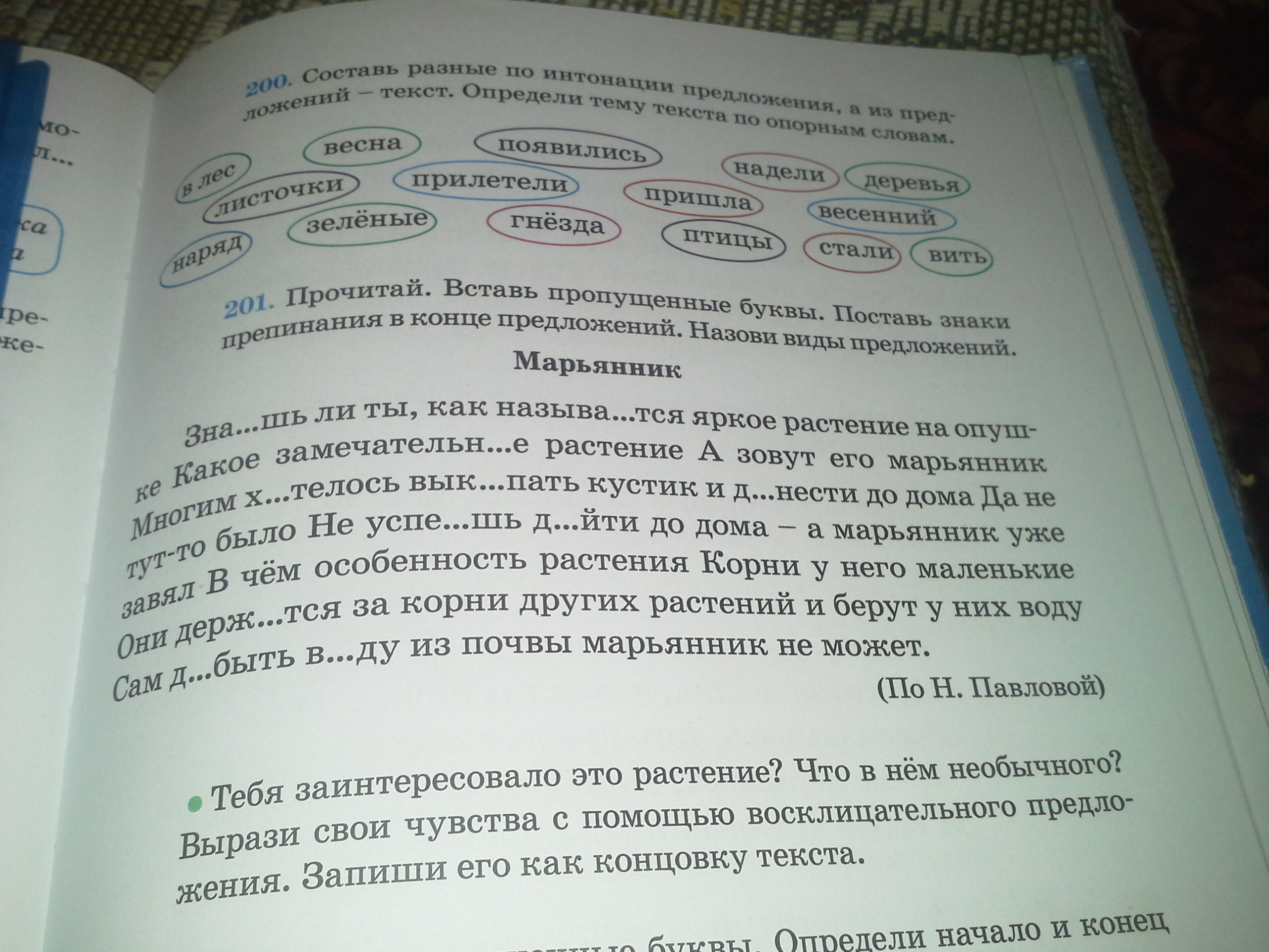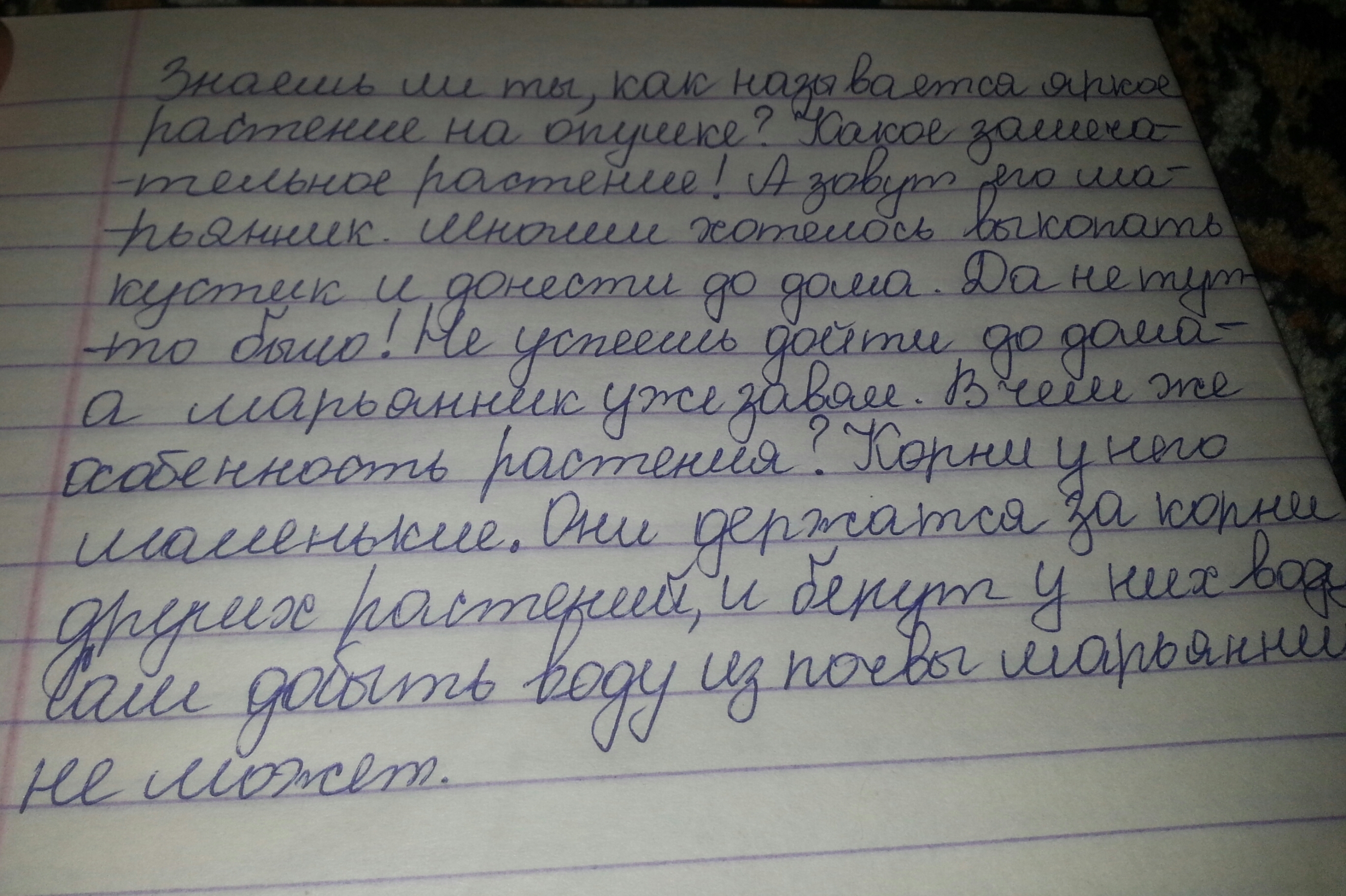 Знаешь ли ты, как называется яркое растение на опушке?Какое замечательное растение! А зовут его марьянник. Многим хотелось выкопать кустик и донести до дома. да не тут-то было!Не успеешь дойти до дома- а марьянник уже завял. В чем особенность растения?Корни у него маленькие. Они держатся за корни других растений и берут у них воду.Сам добывать воду из почвы марьянник не может.