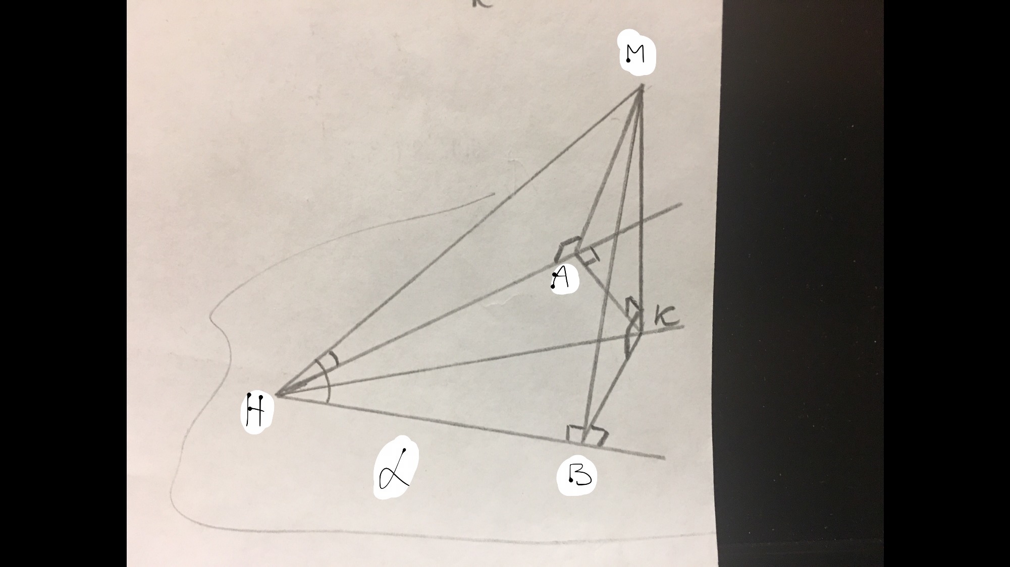 К плоскости a проведена наклонная MH (H принадлежит плоскости a). Докажите, что если проекция наклонной MH образует равные углы с прямыми AH и BH, лежащими в плоскости a, то и сама наклонная MH образует с ними равные углы.
