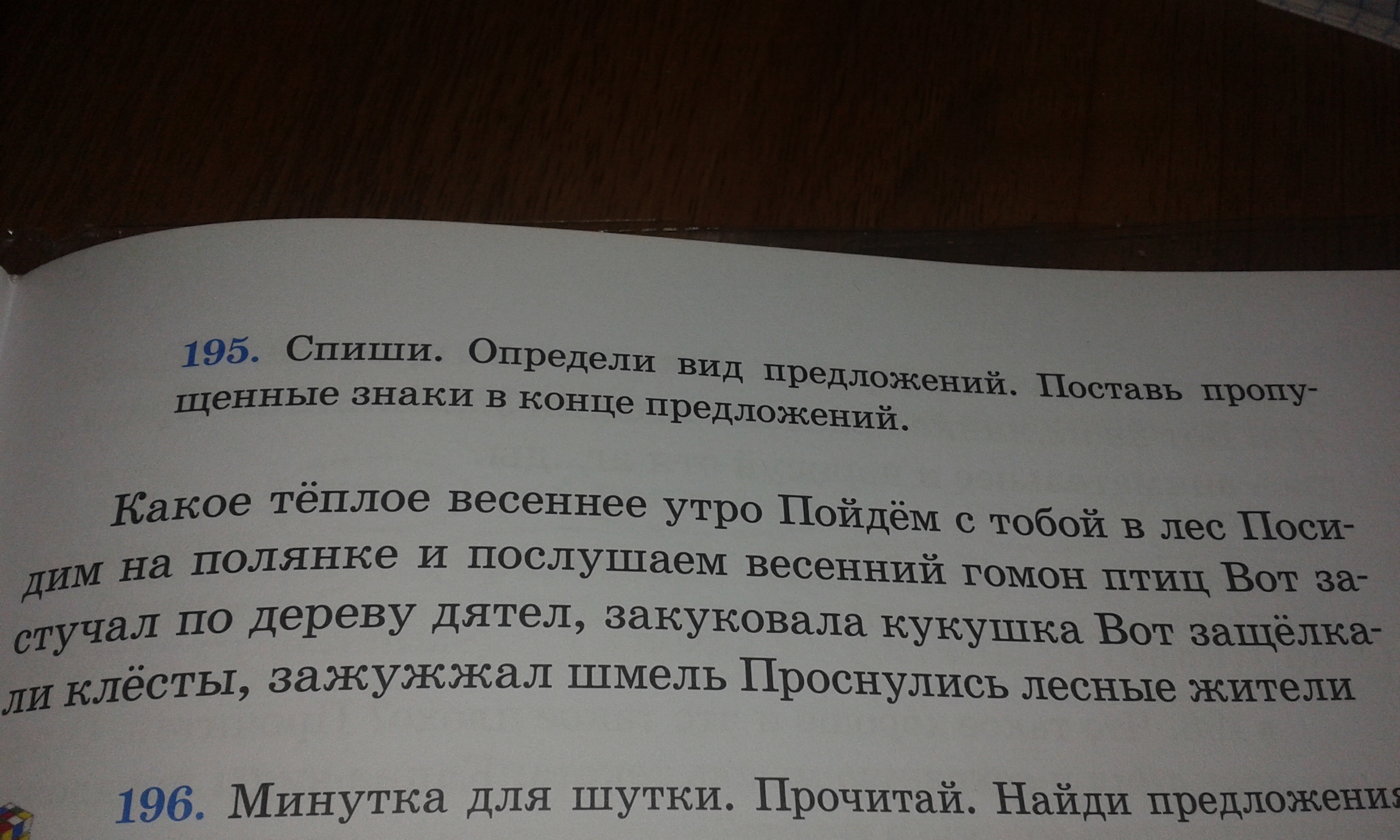 Какое тёплое весеннее утро!-восклицательное.Пойдём с тобой в лес?.-вопросительное .Посидим на полянке и послушаем весенний гомон птиц-побудительное.(Вот застучал по дереву дятел,закуковала кукушка.Вот защелкали клёсты,зажжужал шмель .Проснулись лесные жители.-повествовательный)