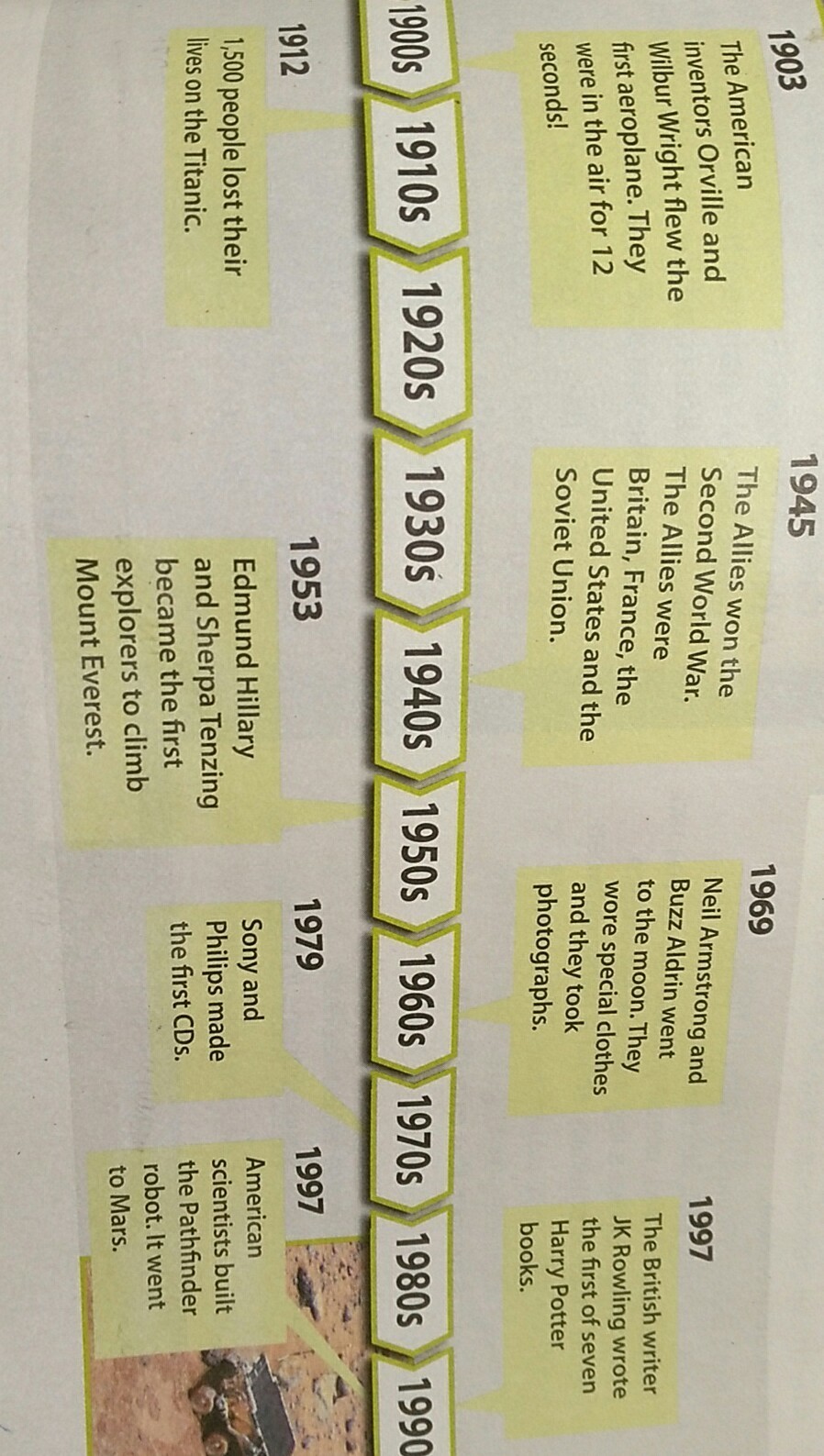 1903 - американские изобретатели Орвилл и Вилбур Врайт полетели на первом аэроплане. Они были в воздухе 12 секунд, 1945 - союзники выиграли вторую мировую войну. союзниками были Британия,Франция, США и Советский союз, 1969 - Нэил Амстронг и Базз Алдрин полетели на луну. они носили специальную одежду и они сделали снимки, 1997 - британская писательница Джоан Кэтлин Роулинг написала первую из 7 книг Гарри Поттера, 1912 - 1500 людей потеряли их жизни на титанике, 1953 - Эдмунд Хиллари и Шерпа Тэнзинг стали первыми исследователями, которые взобрались на гору Эверест, 1979 - Сони и Филлипс сделали первы CD диски, 1997 - американские ученые построили робота следопыта. Он полетел на Марс.