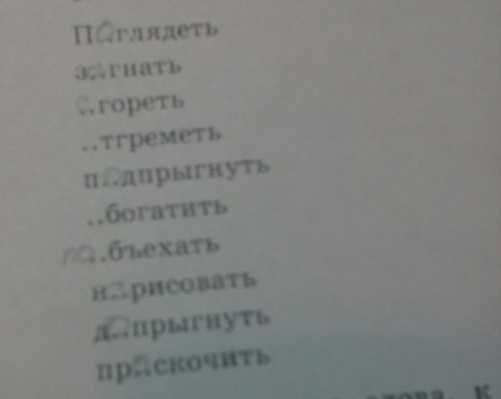 поглядеть-по ,загнать-за, сгореть-с, отгреметь-от, подпрыгнуть-под, сбогатить-с, объехать-о, нарисоваь-на, допрыгнуть-до, проскочить-про.