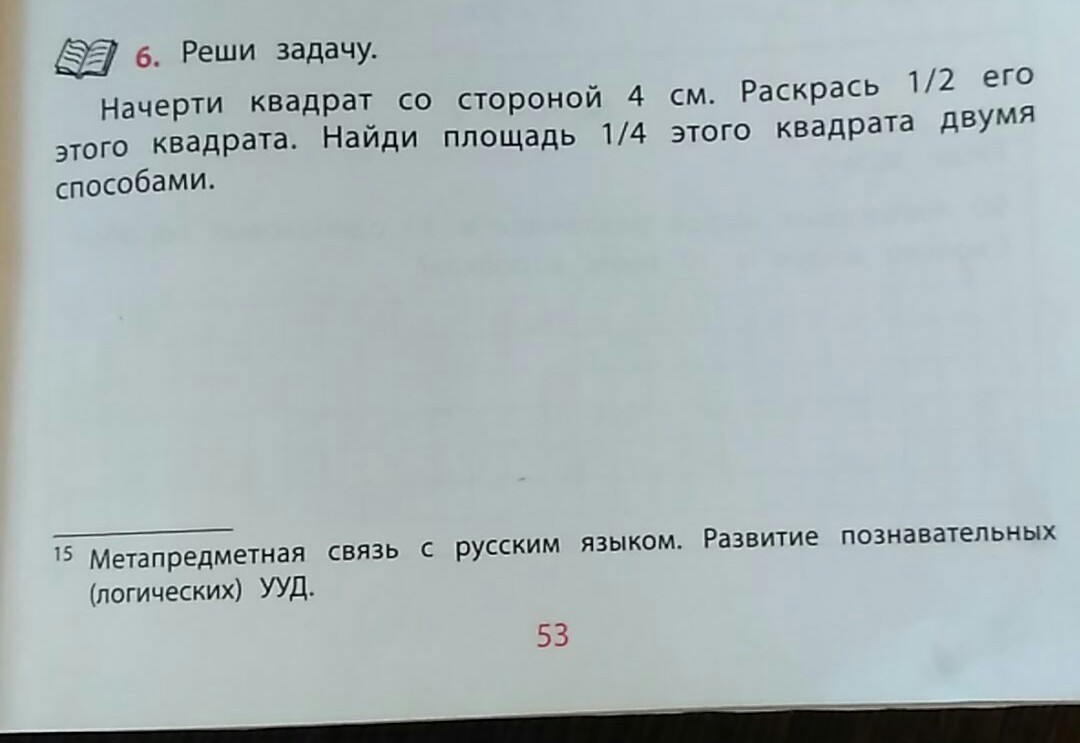 квадрат начертить и половину закрасить сможешь думаю) ну, а чтобы найти 1/4 нужно найти площадь большого квадрата S=a*a=4*4=16 см² площадь маленького16/4=4см² 2 способ 4/2=2 S=a*a=2*2=4см²