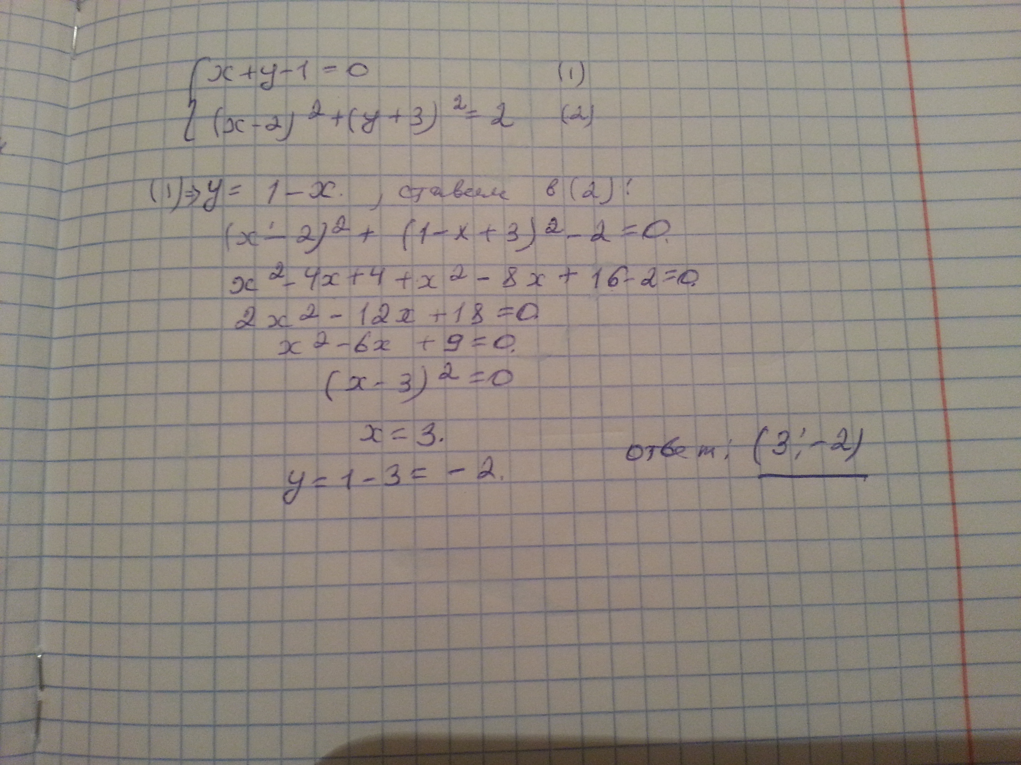 Дам 30 баллов.Найдите точку касания прямой х+у-1=0 и окружности (х-2)в квадрате +(у+3)в квадрате =2