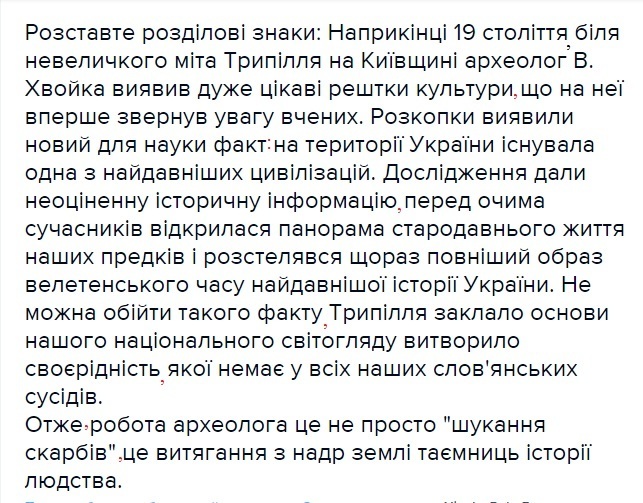Розставте розділові знаки: Наприкінці 19 століття біля невеличкого міта Трипілля на Київщині археолог В. Хвойка виявив дуже цікаві рештки культури що на неї вперше звернув увагу вчених. Розкопки виявили новий для науки факт на території України існувала одна з найдавніших цивілізацій. Дослідження дали неоціненну історичну інформацію перед очима сучасників відкрилася панорама стародавнього життя наших предків і розстелявся щораз повніший образ велетенського часу найдавнішої історії України. Не можна обійти такого факту Трипілля заклало основи нашого національного світогляду витворило своєрідність якої немає у всіх наших слов'янських сусідів.
