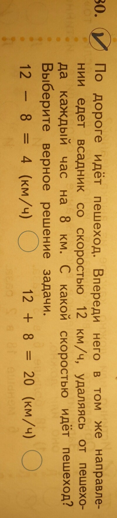 по дороге идет пешеход впереди него в том же направлении едет в садик на со со скоростью 12 км в час удаляюсь от пешехода каждый час на 8 км с какой скоростью пройдет пешеход Выбери верное решение задачи 1)12 минус 8 равно 4 км в час 2)12 плюс 8 равно 20 км в час