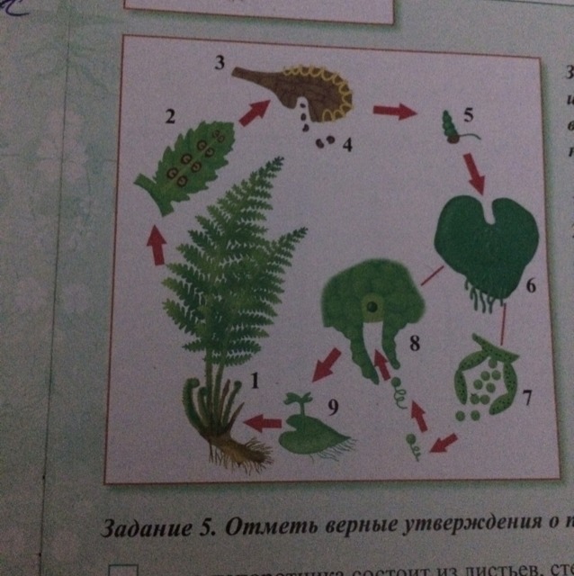 что изображено под каждой цифрой на рисунке?выдели гаметофит-волнистой линией,спорофит-прямой линией.
