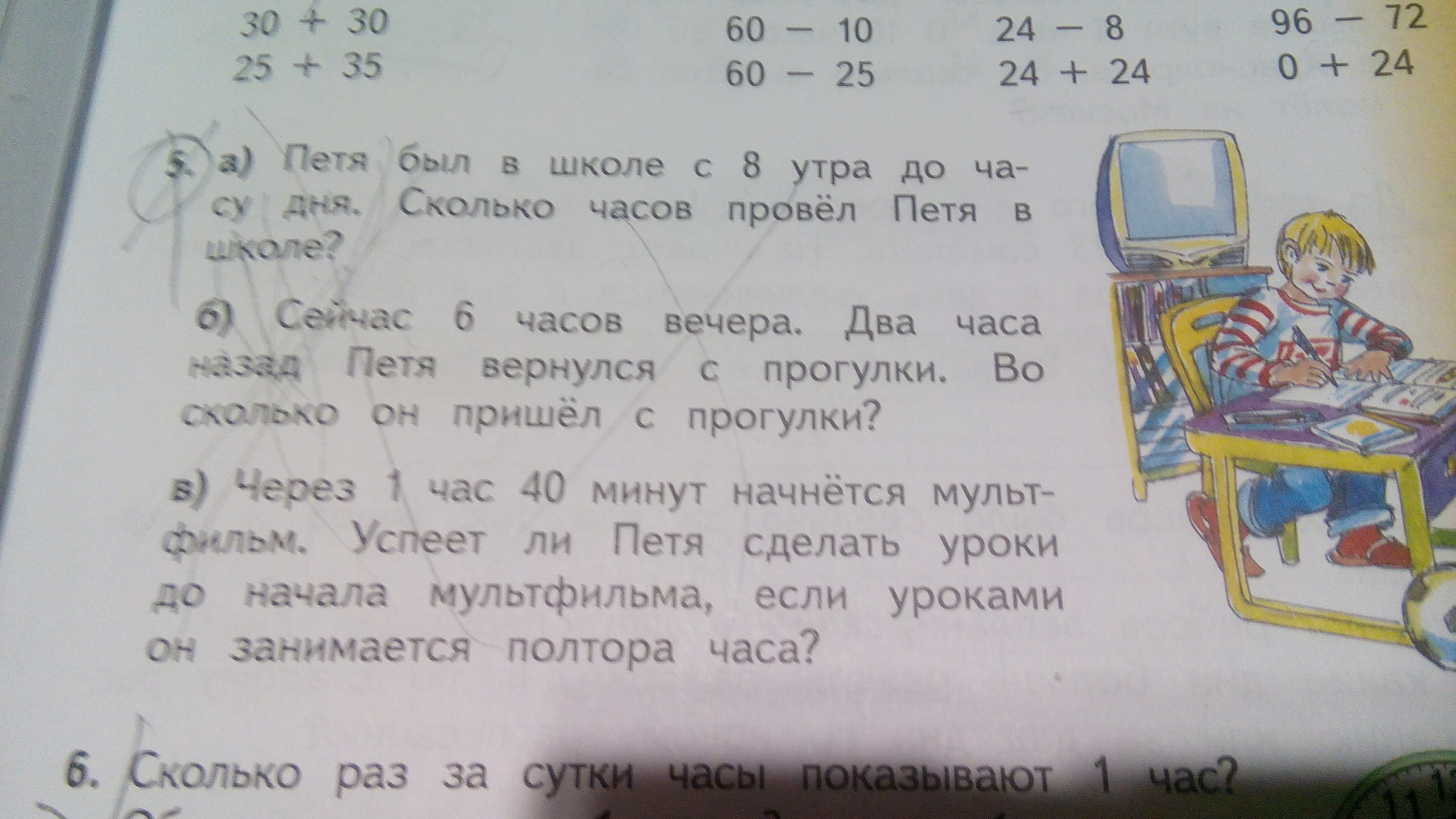 1 ч 30 мин = 90 мин - Петя делает уроки.