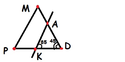 Найдите угол P треугольника PMD ,если угол D = 45 градусов,угол AKD = 85 градусов,а прямые KA и PМ параллельны.
