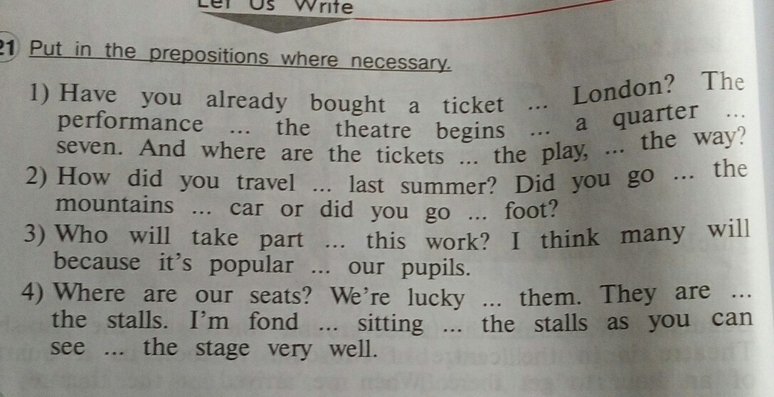 ) Have you already bought a ticket to London? The performance at the theatre begins at a quarter to (past) seven. And where are the tickets for the play, by the way?