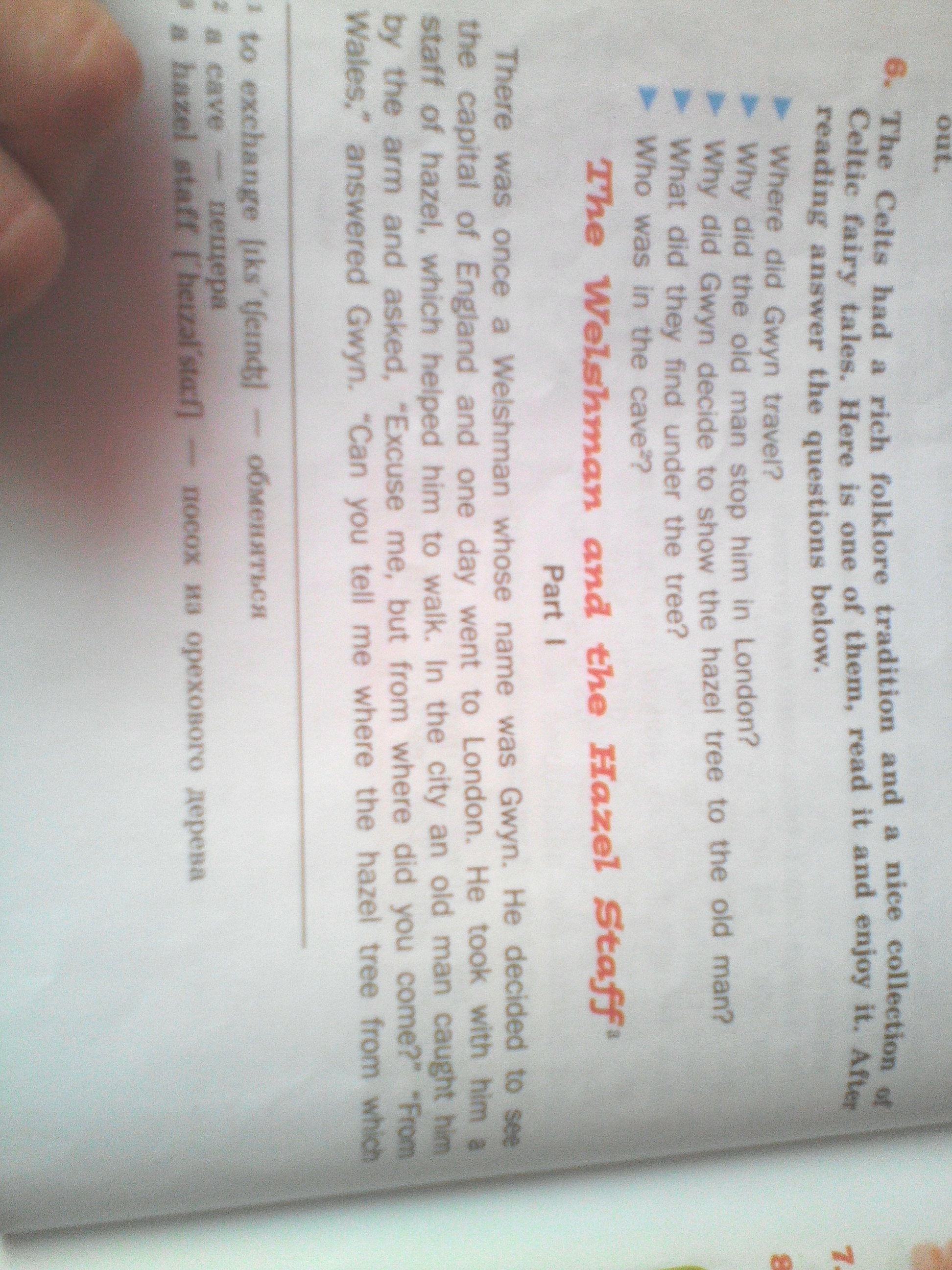 Жил был валлиец по имени Гвин. Он решил повидаться с правителем Англии и в один день отправился в Лондон. Он взял с собой посох из орехового дерева, который помогал ему идти. В городе (Лондоне) один старый мужчина положил Гвину руку на плечо и спросил: "Простите, но откуда Вы пришли?". "Из Уэльса",-ответил Гвин. "Скажите мне, где это ореховое дерево, которое..."