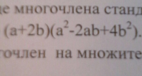 (a+2b)(a²-2ab+4b²)=a³+8b³ вроде бы так)