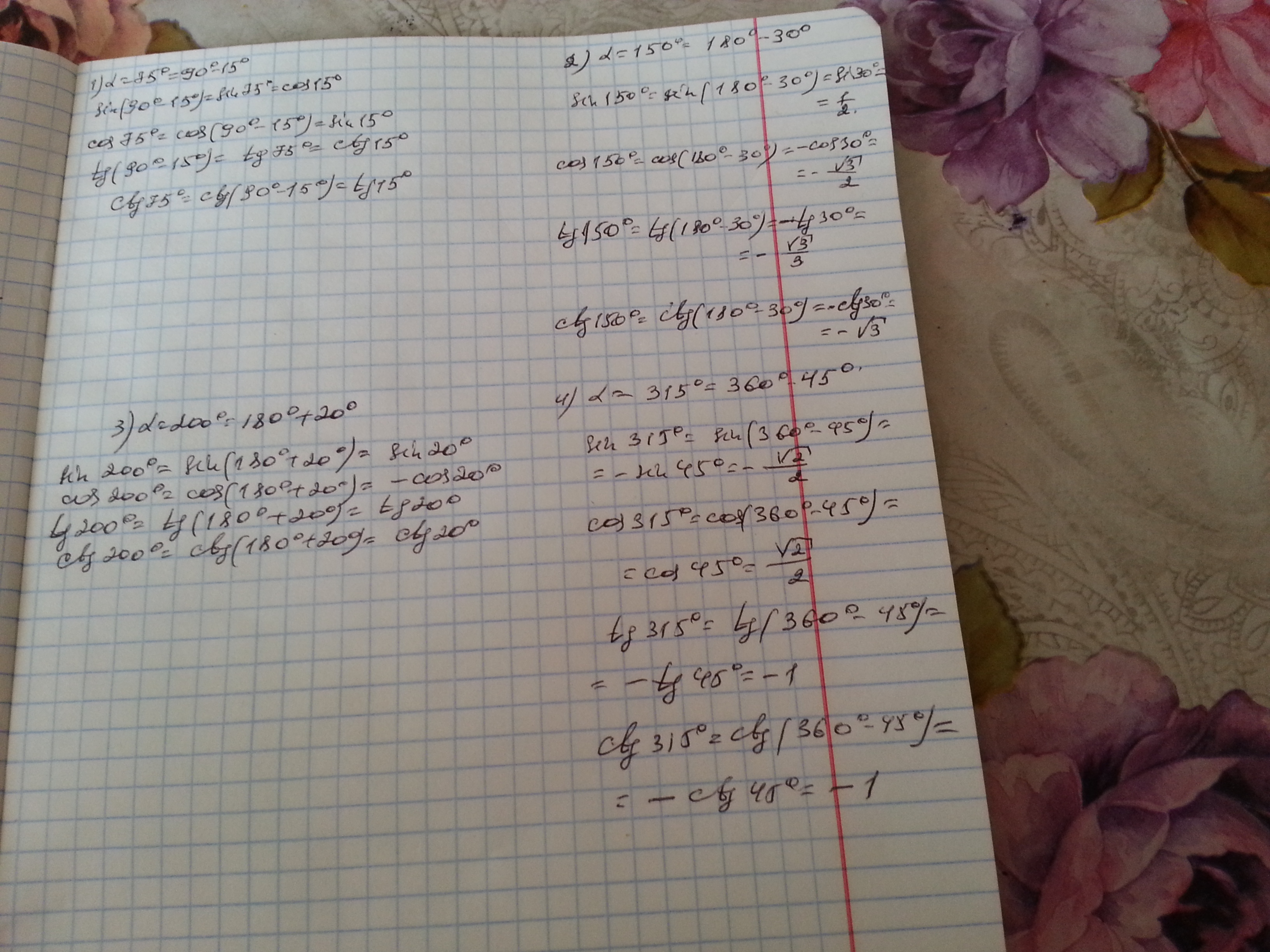 тригонометрические функции углов 75*,150*,200*,315* ,замените функциями, аргументы которых не превышают 45 градусов.