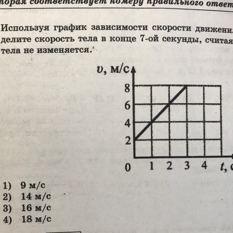 Используя график зависимости скорости движения тела от времени,определите скорость тела в конце 7-ой секунды,считая,что характер движения тела не изменяется