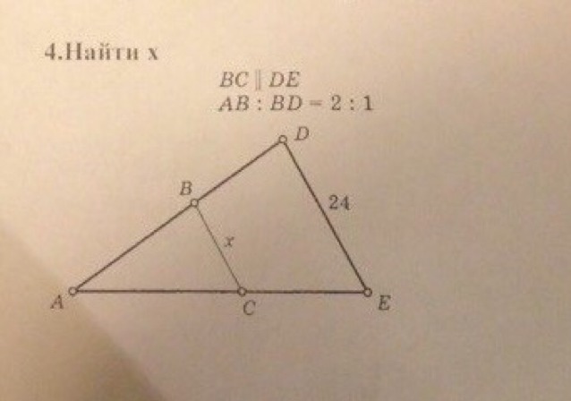 треугольники ABC и ADE подобные=> DE/BC=2/1=>BC=12 сантиметров
