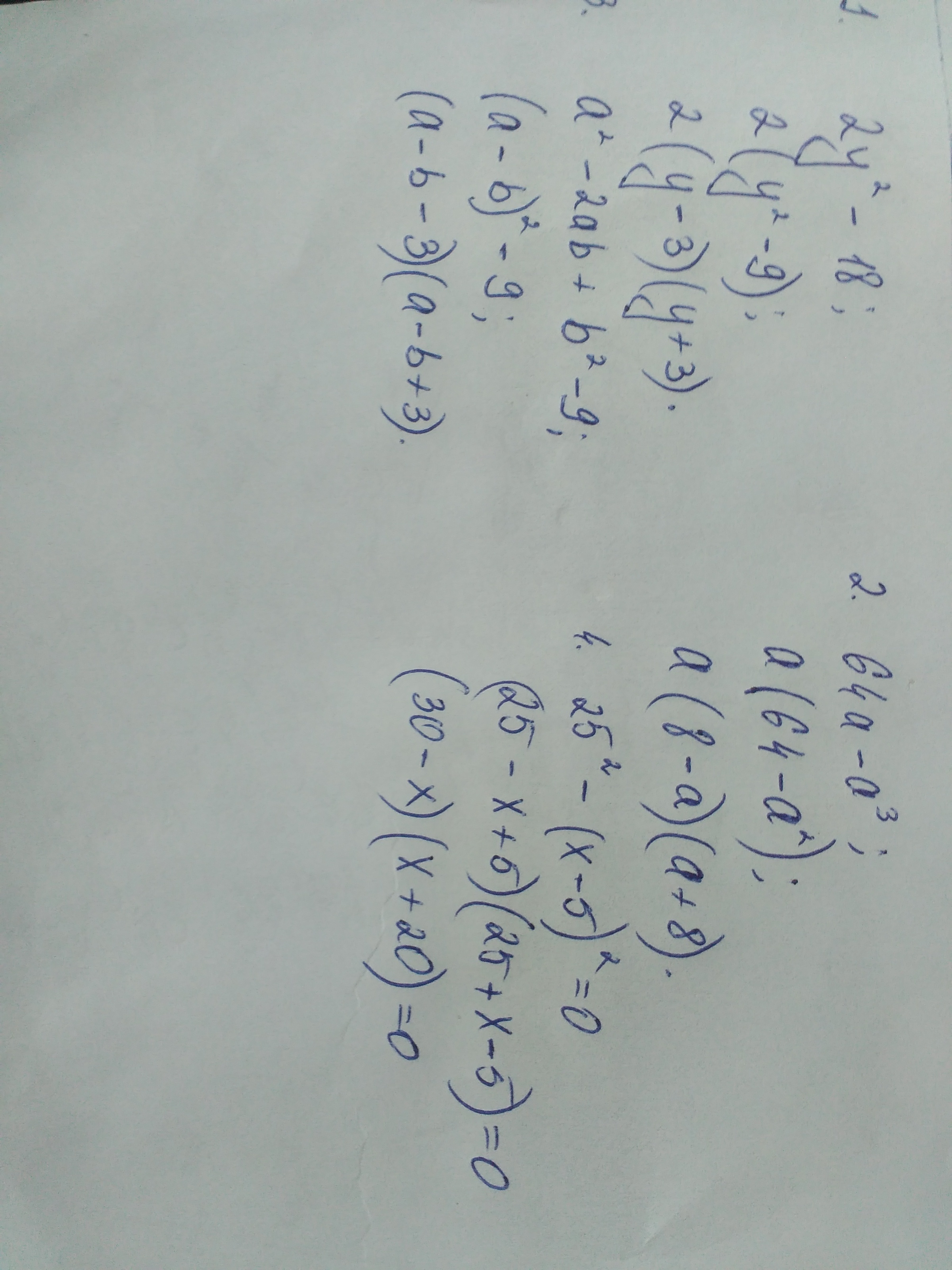 плиз 1)розкласти на множники 2y(до другого степеня) -18 (2) 64a - a3 (30 a2-2ab + b2-9 (4) 25x2-(x+5)2=0