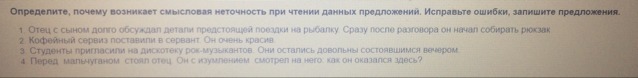 Смысловая неточность, возникает из-за отсутствия знаков препинания. Вот знаки правильно : отец с сыном, долго обсуждали, детали предстоящей поездки, на рыбалку. Сразу, после разговора, они начали собирать рюкзаки. Кофейный сервиз, поставили в сервант. Он очень красив ! Студенты, пригласили на дискотеку, рок-музыкантов. Они остались довольны, состоявшимся вечером ! Перед мальчуганом, стоял отец, он с изумлением смотрел на него, как он оказался здесь?