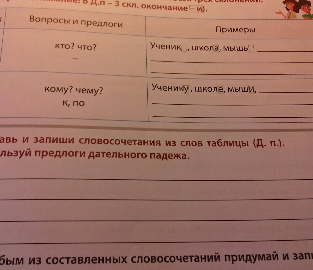 составь и запиши словосочетания из слов таблицы(Д.п.) используй предлоги дательного падежа.
