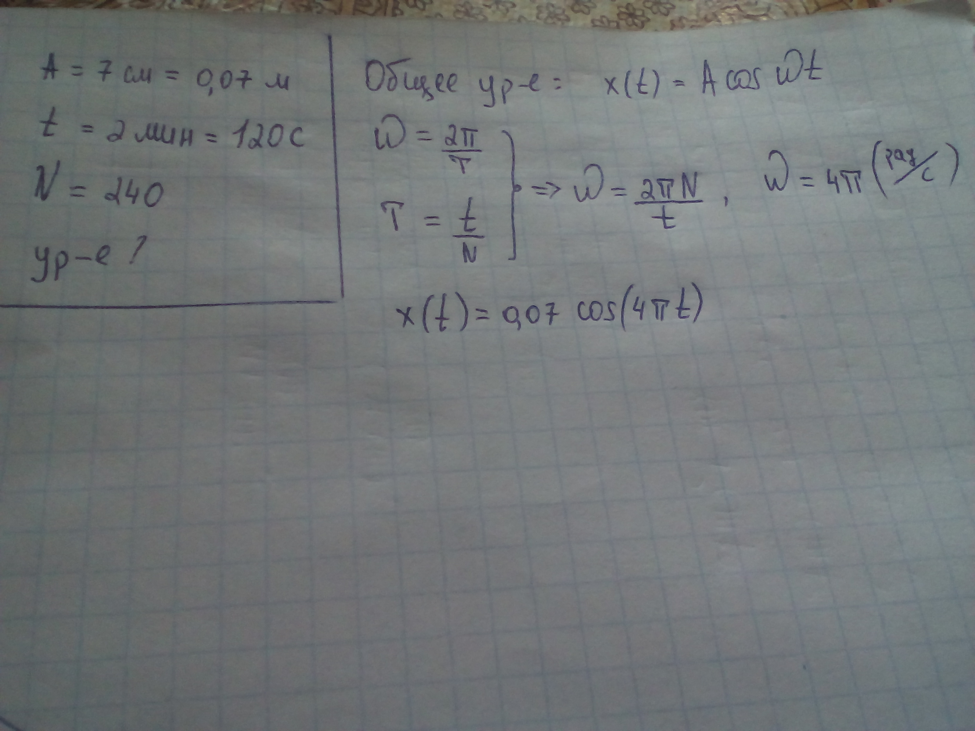 Напишите уравнение гармонических колебаний,если амплитуда равна 7см и за 2 мин совершает 240 колебаний