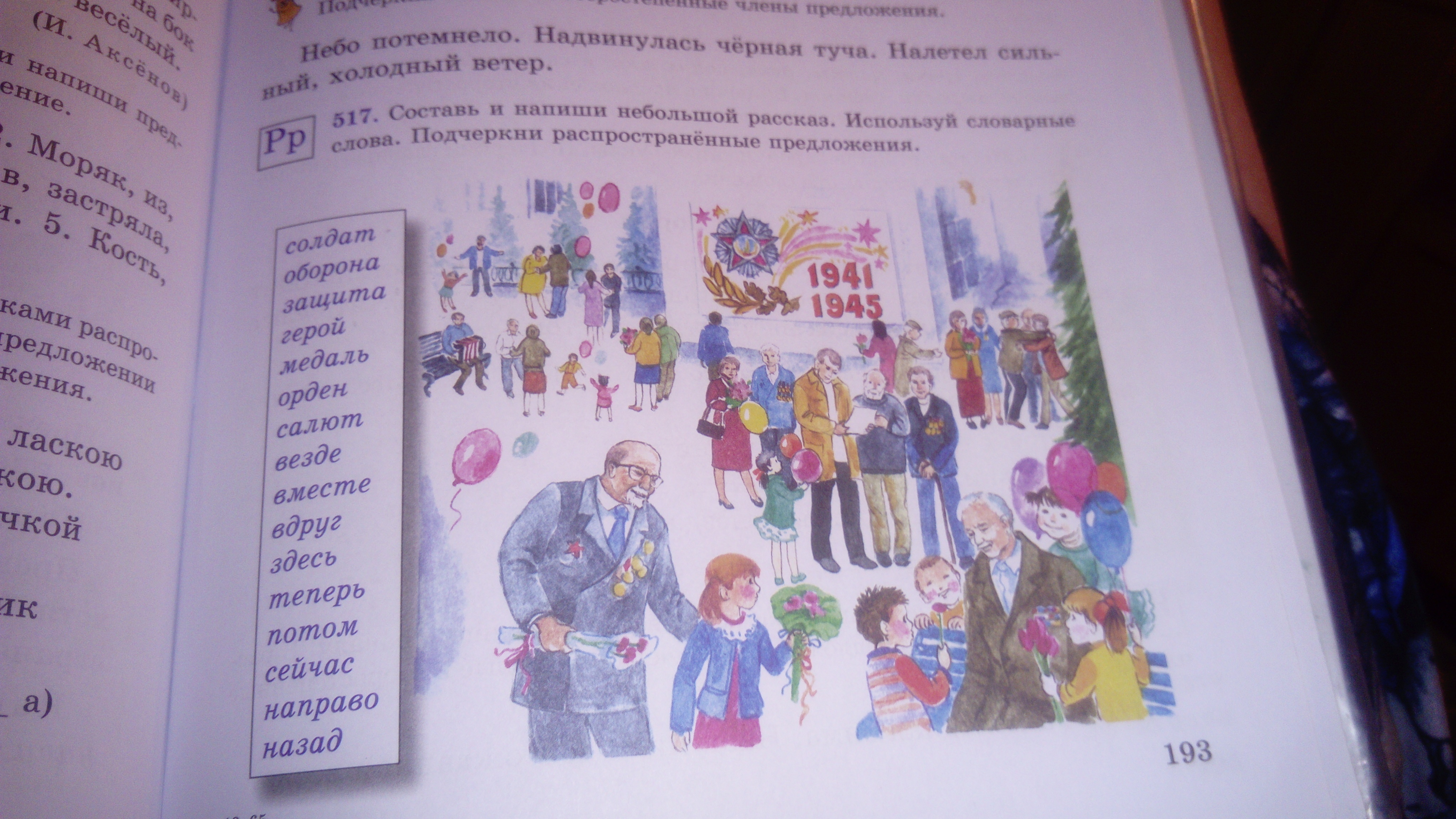 Наступило 9 мая!!!! Везде высыпали взрослые и дети. Здесь была девочка, у которой отец был военный. Она не успела подарить ему цветы и шла с ними домой. Вдруг она вздрогнула и обернулась назад, перед ней стоял отец защитник страны и трогал её за плечо. Она обрадовалась, подарила ему маргаритки и они пошли домой. Неожиданно грянул салют. Отец и девочка посмотрели на салют и обнявшись пошли домой.