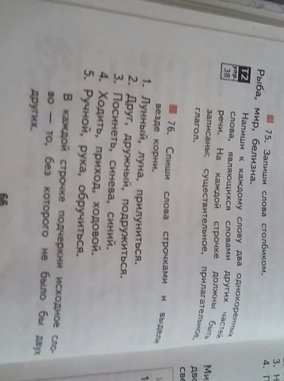 запиши слова в столбик рыба,мир, белизна.Напиши к каждому слову два однокореныхслова являющихся словами других частей речи . на каждом строчке должны быть записаны:существительные,прилагательное и глагол. и упр 76 .пажалуйста помогите