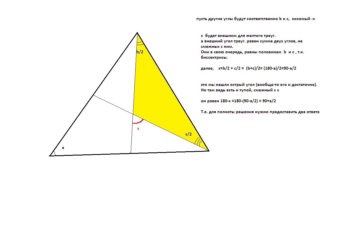 Один з кутів трикутника дорівнює а. Знайдіть кути, які утворюються при перетині бісектрис двох інших кутів.