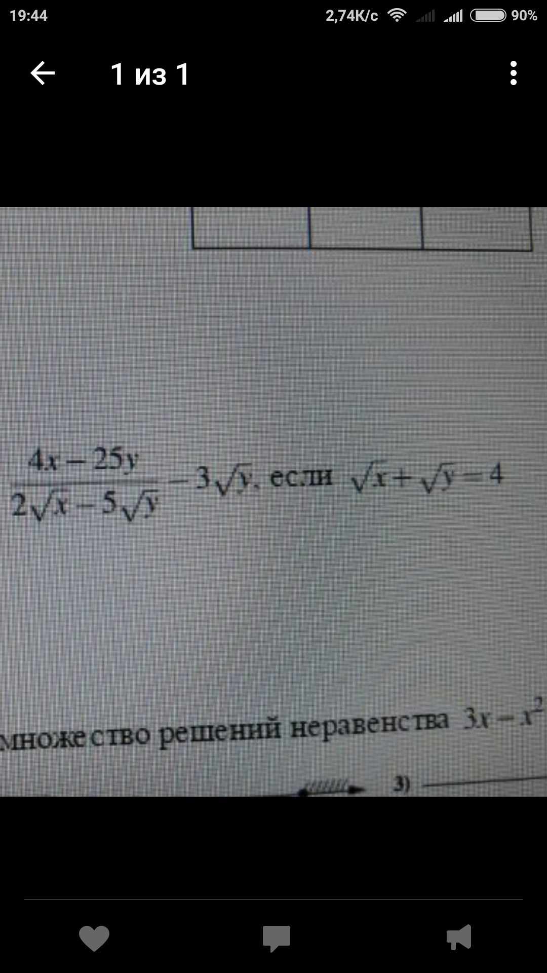 Представим числитель дроби в виде разности квадратов (2 корня из х - 5 корней из у)*(2 корня из х + 5 корней из у)/(2 корня из х - 5 корней из у) -3 корня из у . Сократив на знаменатель, получим 2 корня из х + 5 коней из у - 3 корня из у = 2 корня из х + 2 корня из у = 2*( корень из х + корень из у) = 2*4=8