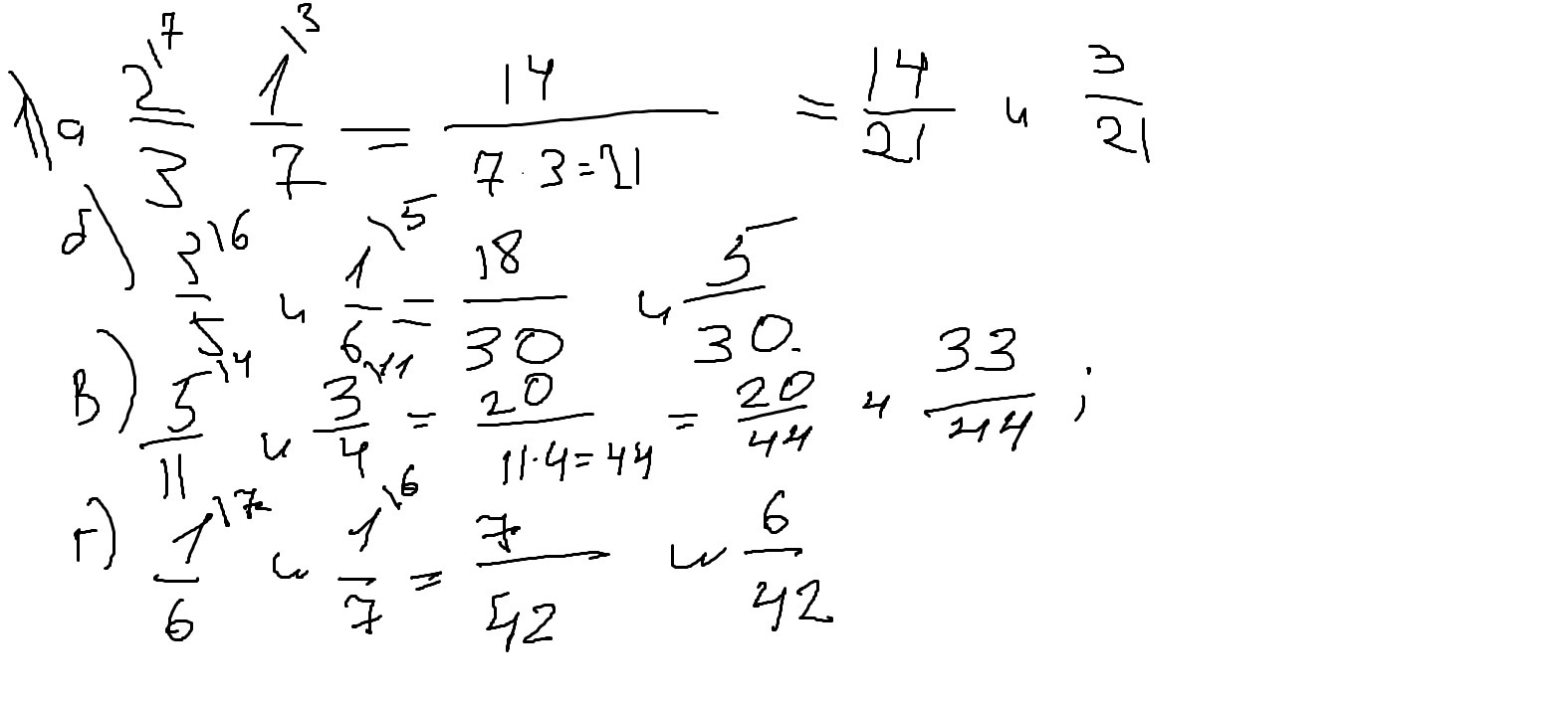 Смотри бро, всё просто, общей знаменатель - это число которое делится и на число под первой дробью и под второй, самый простой способ его найти умножить нижнее число первой дроби на нижнее число второй, а потом числитель ( верхнее число) первой дроби домножаешь на знаменатель второй и соответственно, числитель второй дроби на знаменатель первой. Первое я тебе решил, если надо могу решить и остальные.