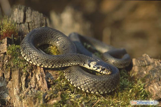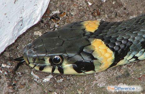 Различия: Ужи длиннее и тоньше гадюк. У ужей "желтые уши", у многих гадюк - зигзаобразная полоса вдоль спины. Уж неядовит, но обитает вблизи водоемов, гадюки предпочитают леса. Ужи питаются лягушками, гадюки преимущественно мышами. Ужи не нападают первыми, предпочитая скрыться, а гадюка на редкость агрессивна.