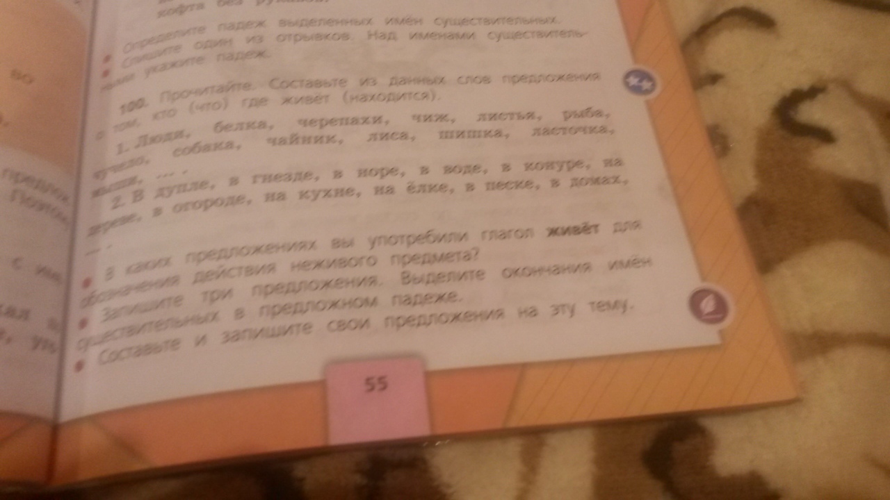 Люди живут в домах. Белка живёт в дупле. Черепахи живут в песке. Чиж живёт в гнезде. Листья живут на дереве. Рыба живёт в воде. Чучело живёт на огороде. Собака живёт в будке. Чайник живёт на кухне. Лиса живёт в норе. Шишка живёт на ёлке. Ласточка живёт на скале. Мыши живут в норе.
