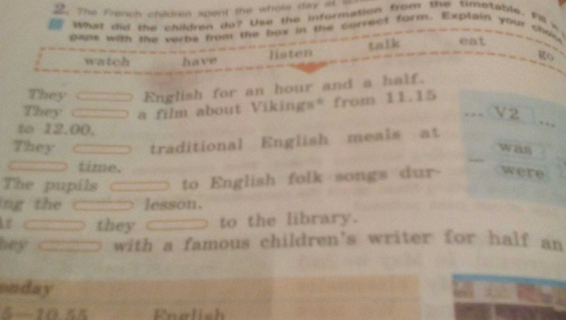 Срочно., пж прошу. The French children spent the day at school. What did the children do? Use the information from the timetable. Fill in the gaps with the verbs from the box in the correct from. Explain your choice