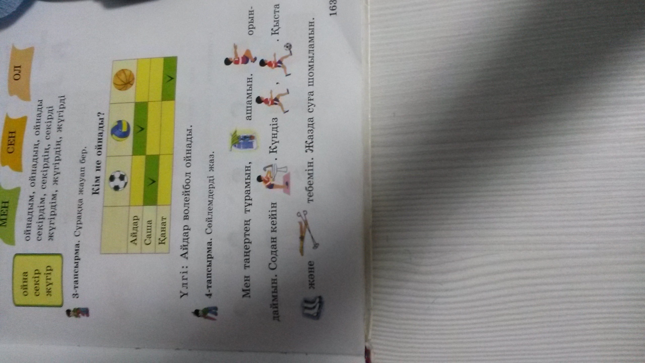 мен таңертең тұрамын терезені ашамын.жаттығу орындаймын .содан кейін жуынамын.күндіз жүгіремін,доп тебемін.қыста коньки,шаңғы тебемін .жазда суға шомыламын