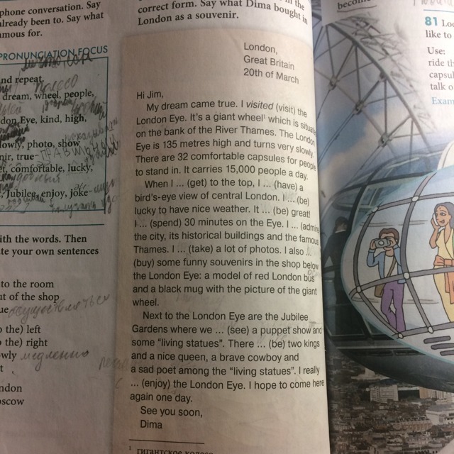 Когда я поднялся наверх,я увидел центр Лондона с высоты птичьего полета.Мне повезло с погодой,она была хорошая.Это было здорово! Я провел 30 минут там. Я восхищался городом,его историческими зданиями и знаменитой Темзой.Я сделал много фотографий.Также я купил сувениры в сувенирной лавке,которая находится внизу колеса обозрения- уменьшенную копию лондонского двухэтажного автобуса и черную кружку с изображением колеса обозрения.