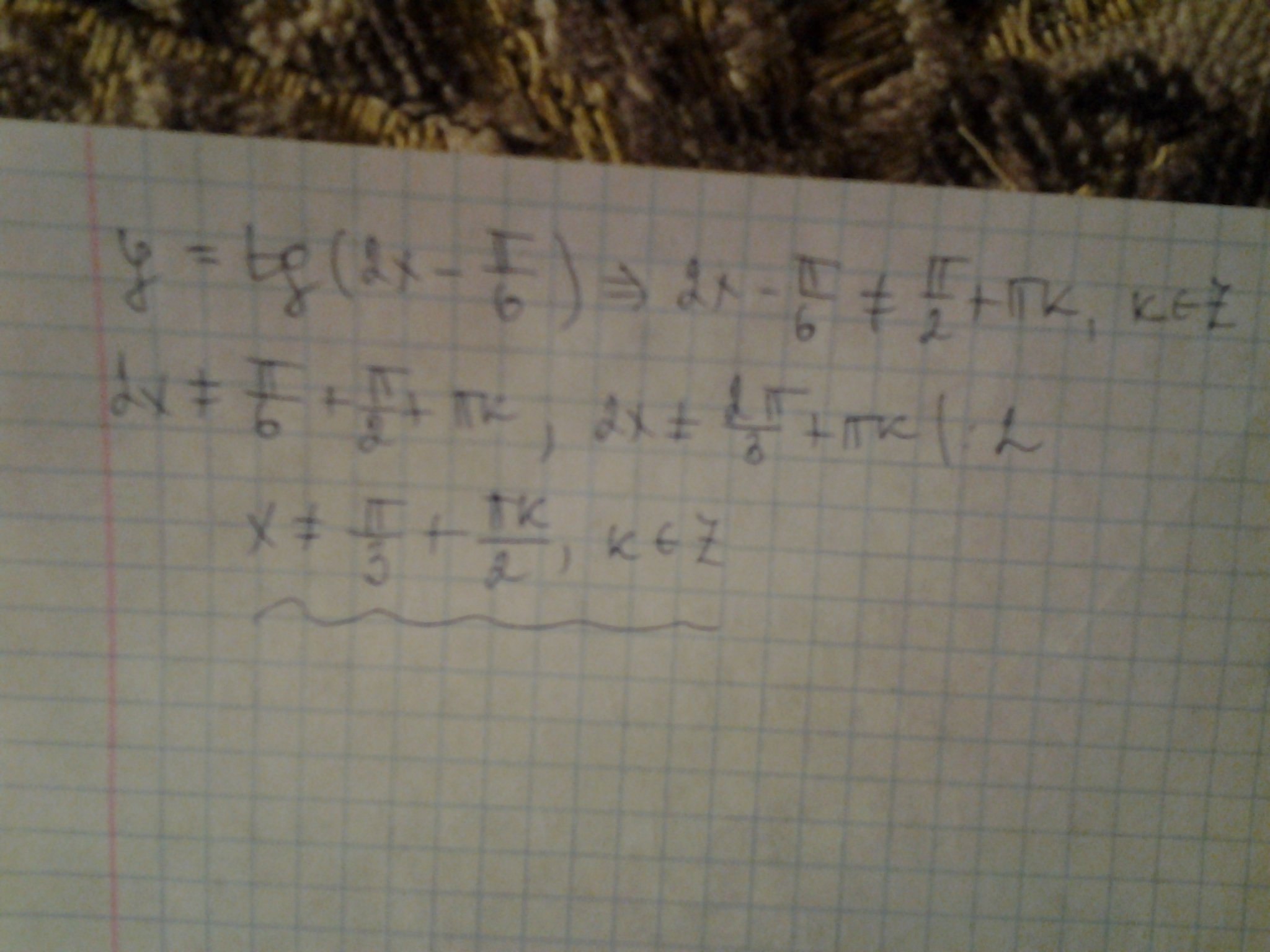 tg не будет иметь решения когда 2х-П/6 равняется 90( тк tg90=пустое множество)