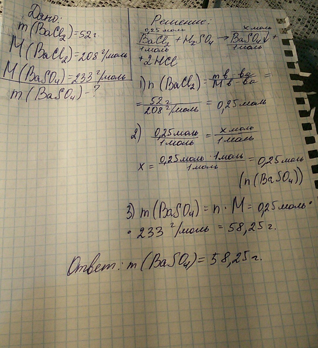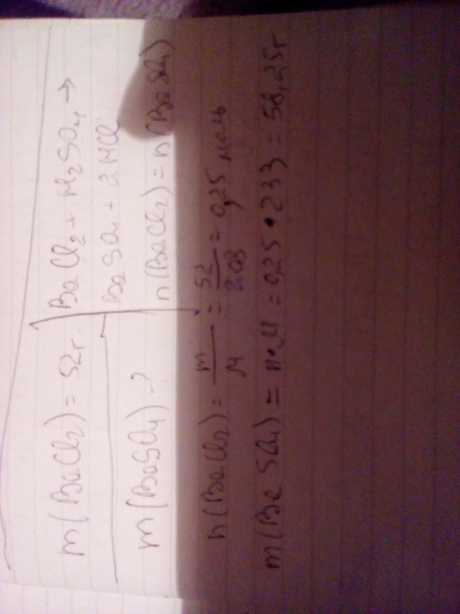 Вычислите массу осадка, образующегося при взаимодействии 52 граммов хлорида бария с серной кислотой. BaCl2 + H2SO4=BaSO4 +2HCl. Напишите решение задачи.