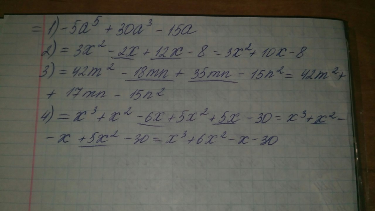 представьте в виде многочлена выражение: 1)-5а(а^4-6a^2+3) 2)(x+4)(3x-2) 3)(6m+5n)(7m-3n) 4)(x+5)(x^2+x-6)