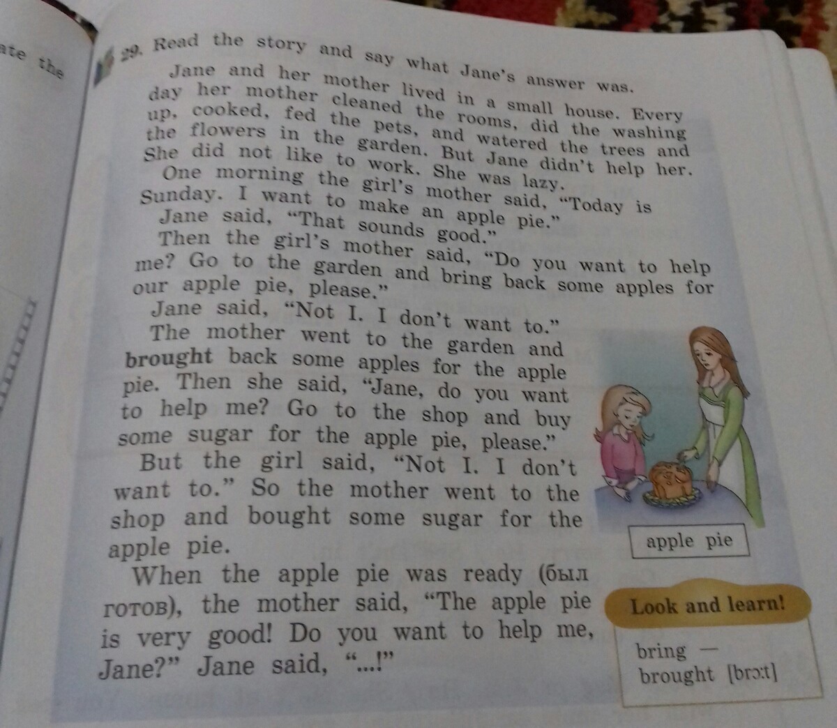 Когда яблочный пирог был готов, мама сказала:"Яблочный пирог очень вкусный(хороший)!Хочешь помочь мне, Джейн?