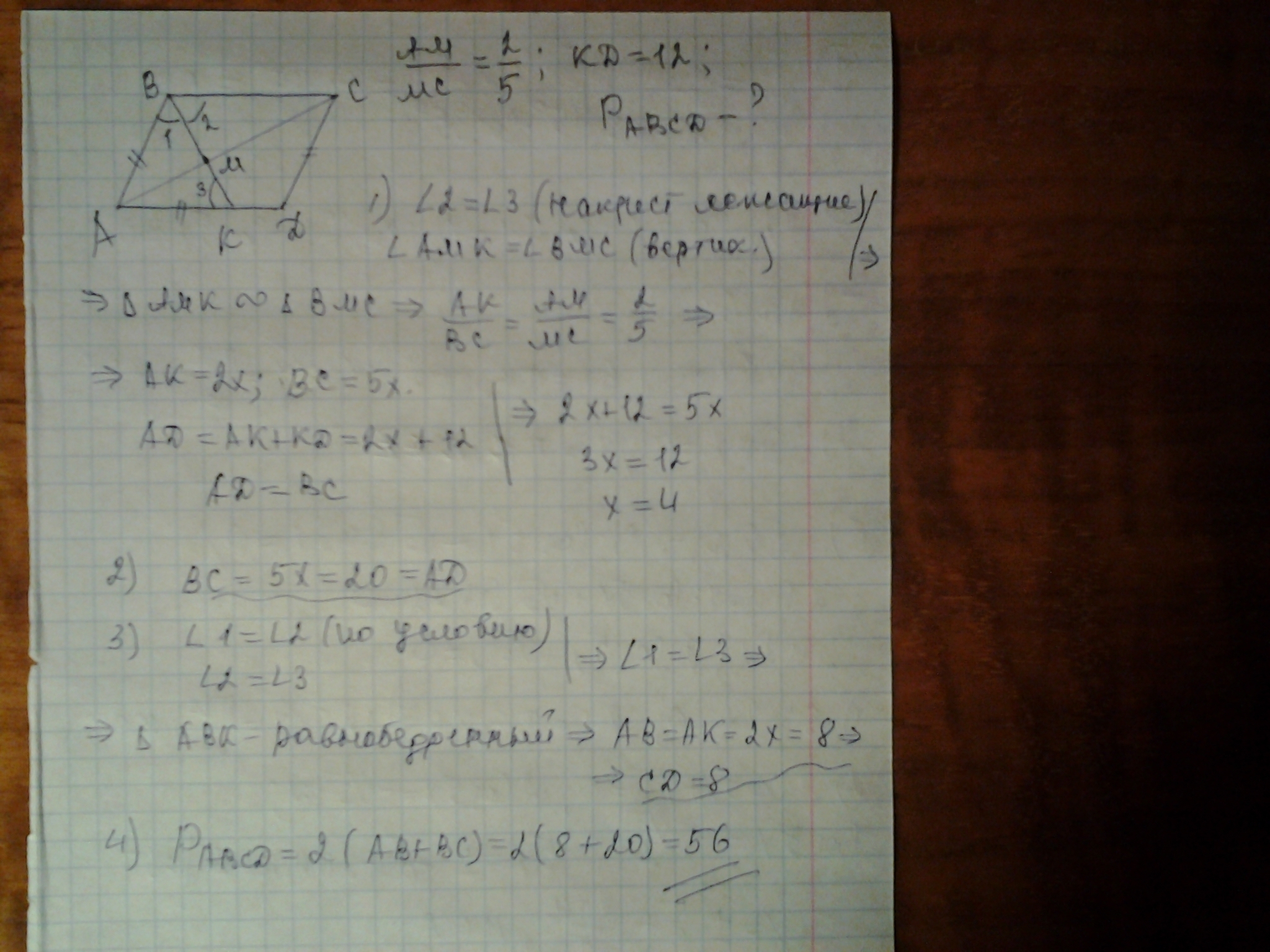 помогите прошу очень срочно Биссектриса тупого угла АВС параллелограмма АВСД пересекает сторону АД в точке К, а диагональ АС в точке М. НАЙДИТЕ периметр ПАРАЛЛЕЛОГРАММА ,если АМ:МС=2:5, КД =12