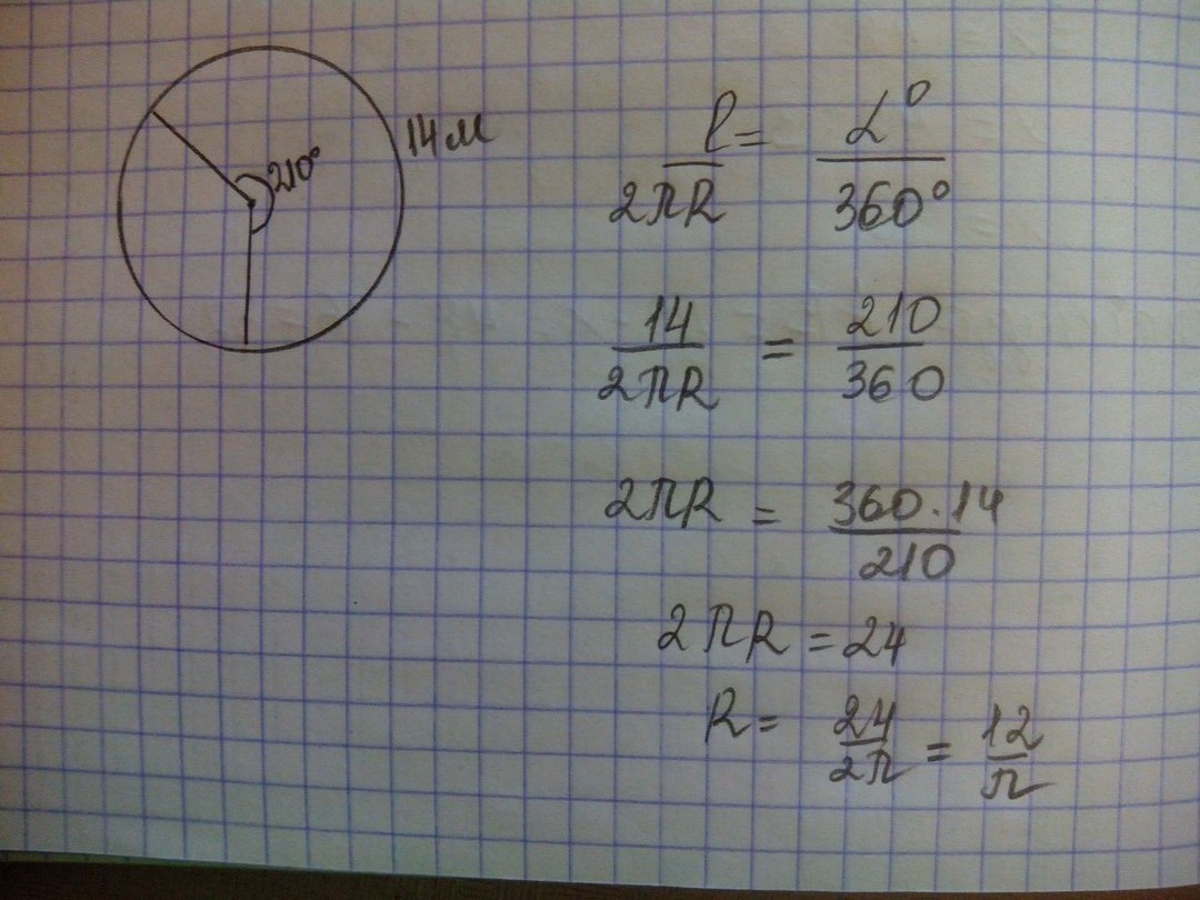 Определите радиус окружности,если центральному углу в 210° соответствует дуга длинной 14 м . округлить до 10.