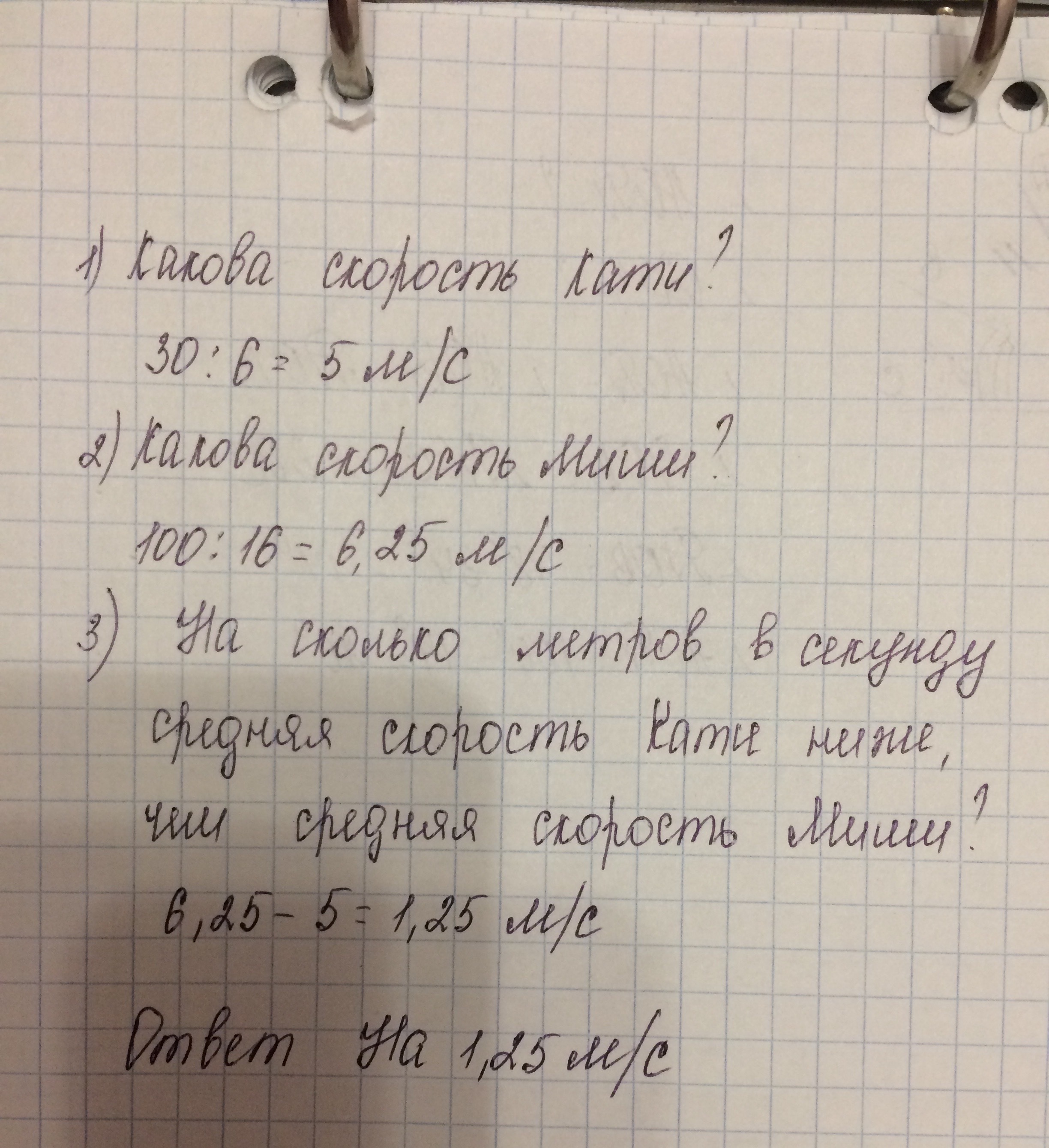 Катя пробежала 30 метров за 6 секунд, а Миша пробежал 100 метров за 16 секунд. Определите, на сколько метров в секунду средняя скорость Кати была ниже, чем средняя скорость Миши.