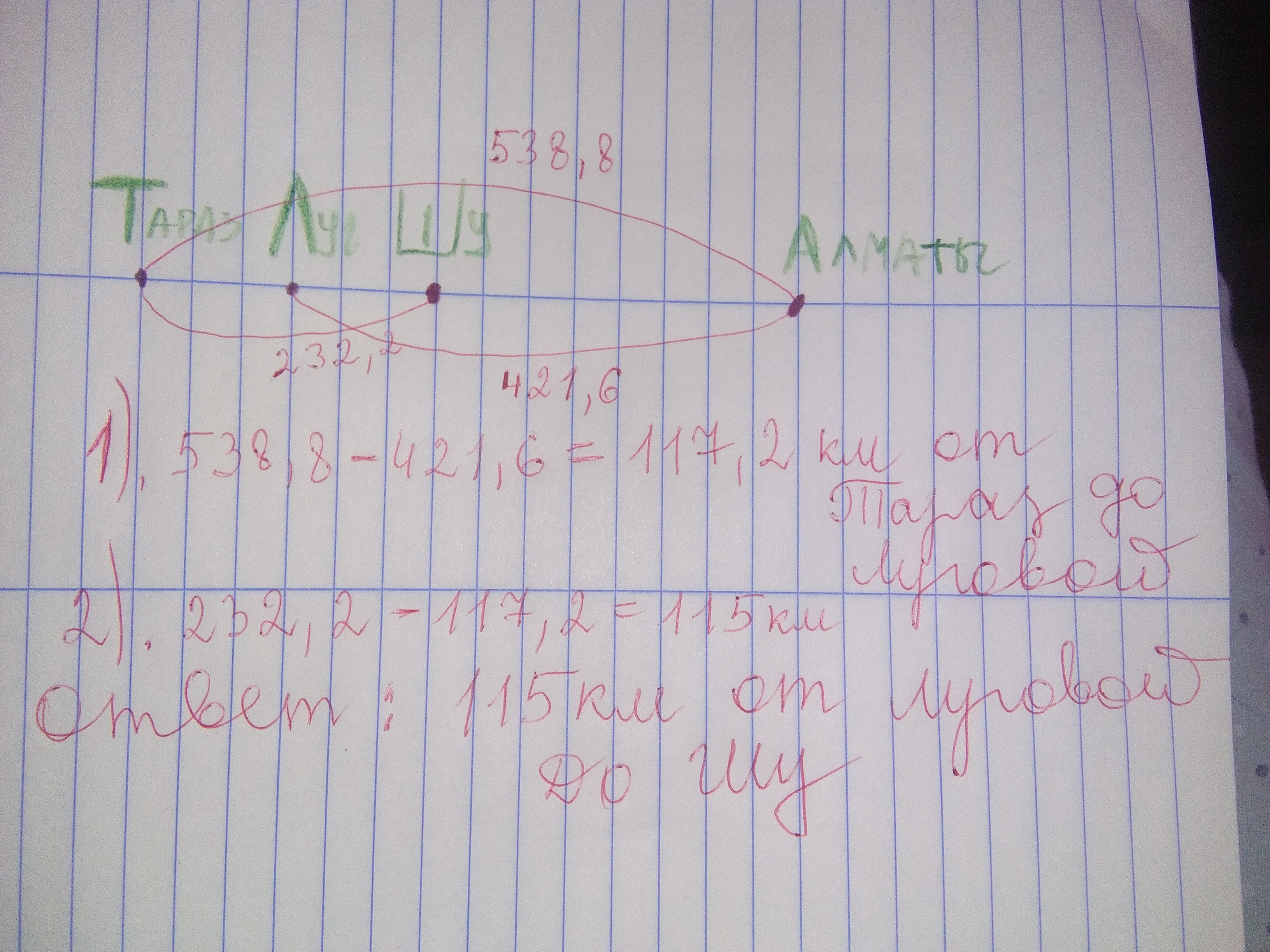 решите задачу Расстояние от станции Тараз до станции Алматы 538,8 км . Расстояние от станции Тараз до станции Шу 232,2 км,а от станции Луговая до станции Алматы 421 3/5 км.Найдите расстояние от станции луговая до Станции Шу