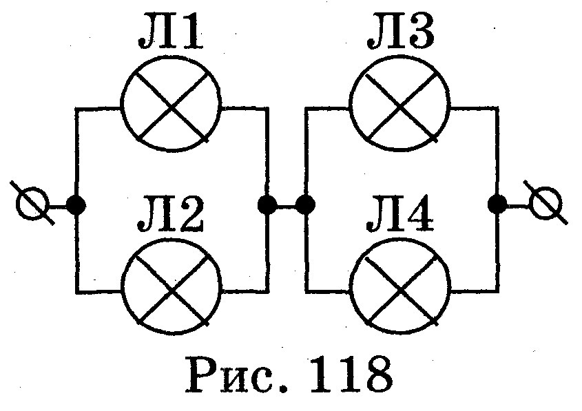 Чему равно общее сопротивление электрической цепи, изображенной на схеме (рис. 118), если сопротивления лампочек равны R1 = 8 Ом, R2 = 8 Ом, R3 = 3 Ом, R4 = 3 Ом?